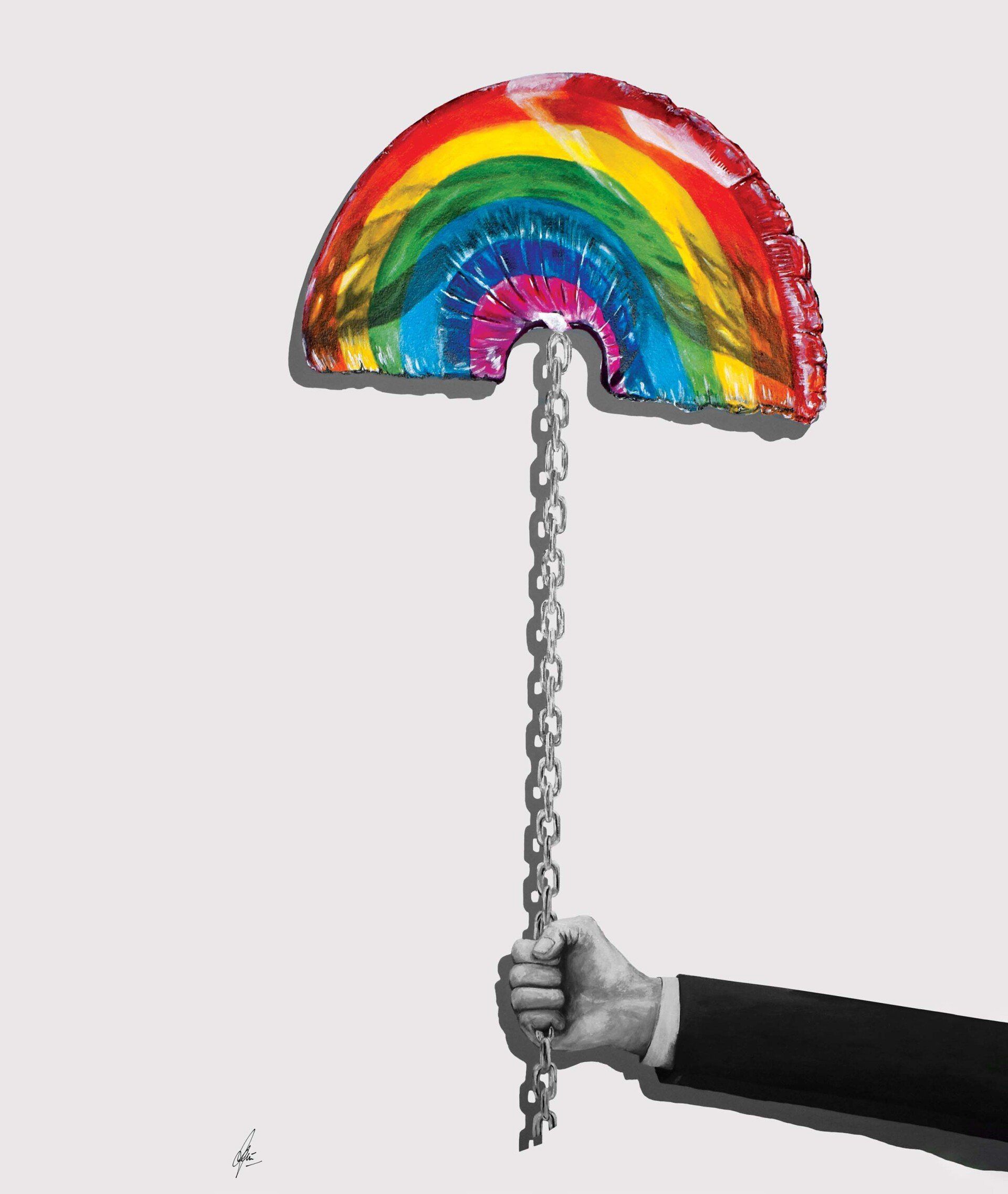 Joseph Willoughby, Freedom? - This piece represents the concept of being free. Free from mental health or an economy and political burdens that weigh down the idea of a peaceful life. Freedom in this scenario is represented by a rainbow balloon, being oppressed by a silver chain and white-collar wrist.
