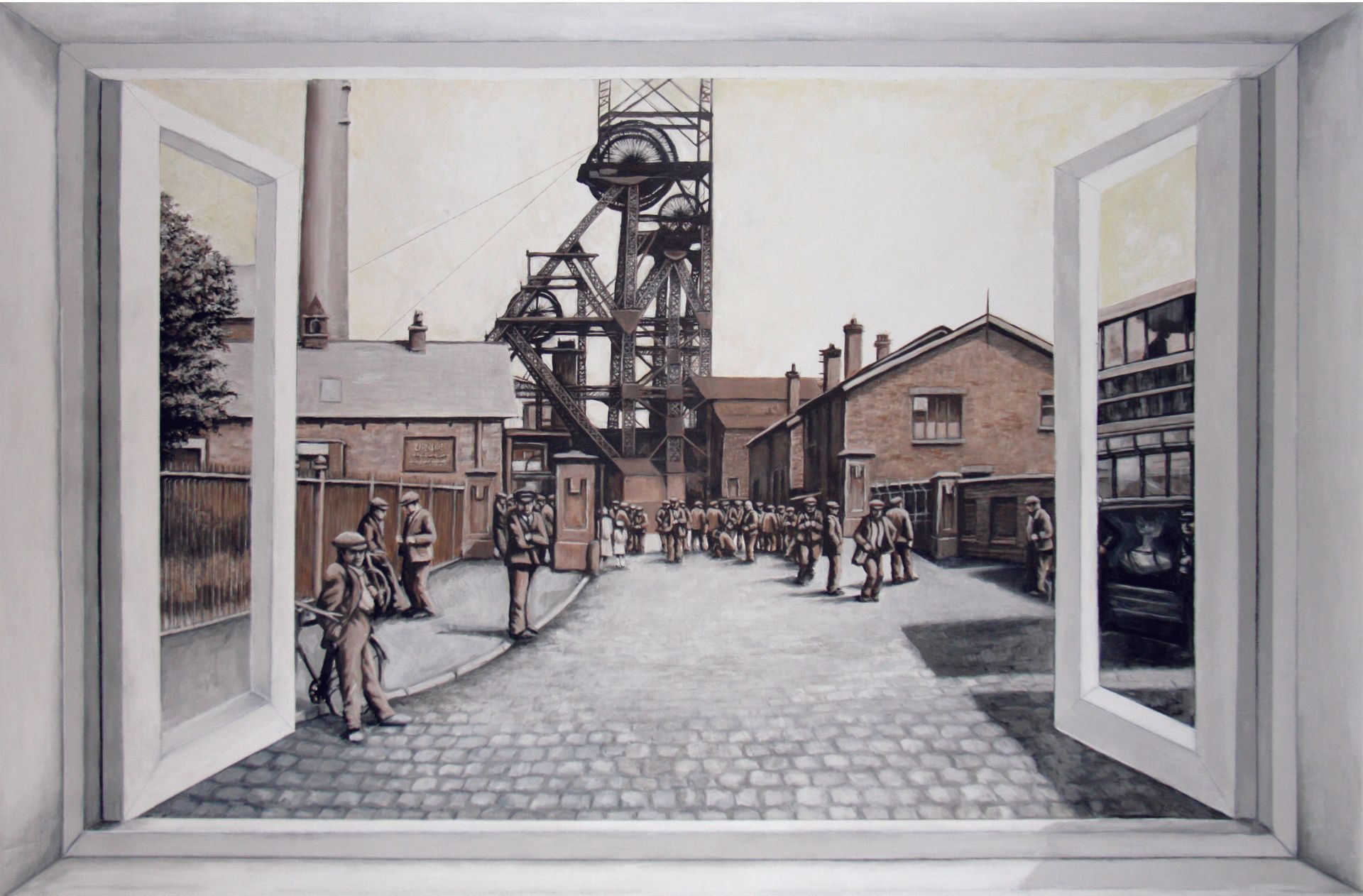 Tracey Elliott, Opening the windows to our past - I was asked if I’d paint something on a wall in our village club as a favour. My village has an old pit, now the Lancashire Mining Museum and I thought this would be a topical and nostalgic thing to paint. I got permission to use a photo and decided the best way to show it would be through a window. The response to this painting was amazing and deeply moving for me because I didn’t realise how many people it would touch, or the memories it would evoke. I am indebted to the local community for their encouragement, their stories and their praise.