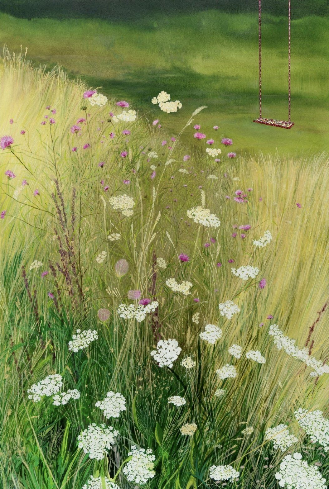 Agnes Sheikh, Fragility - Since April 2020, a swing has appeared in my work - lonely, still, or in motion. Acting as a form of meditation and catharsis, the swing allows me to release negativity, leading to emotional restoration and renewal. In this particular painting, close-up perspective of natural world, flowers highlight the theme of fragility and ephemerality. Contrasting with this theme and using fancy stones for my swing, I wanted to create a piece of jewelry, offering strength and considered as a talisman, a protection for me and my fragilities. “Fragility” celebrates the different feelings we carry in, the tiny frontiere between security and uncertainty, anxiety and serenity, chaos and peace and the constant search for balance.