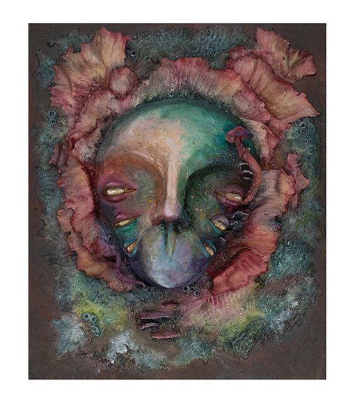 Bailey Graham, Emerging | 3D sculpture painting on wood board - #1 in environmental series. This piece represents a personified mother nature, as all pieces in this series. Being the main piece, you can see the head emerging from growth, bringing the start of new life. I sculpt to bring a personality to nature. Through my work, hidden earth elements, growth and decay are commonly seen, hinting on climate change, and various issues across the globe. Growing up around nature, I seen the direct impact climate change is having on our planet, and my work is a way of translating this to inspire change.