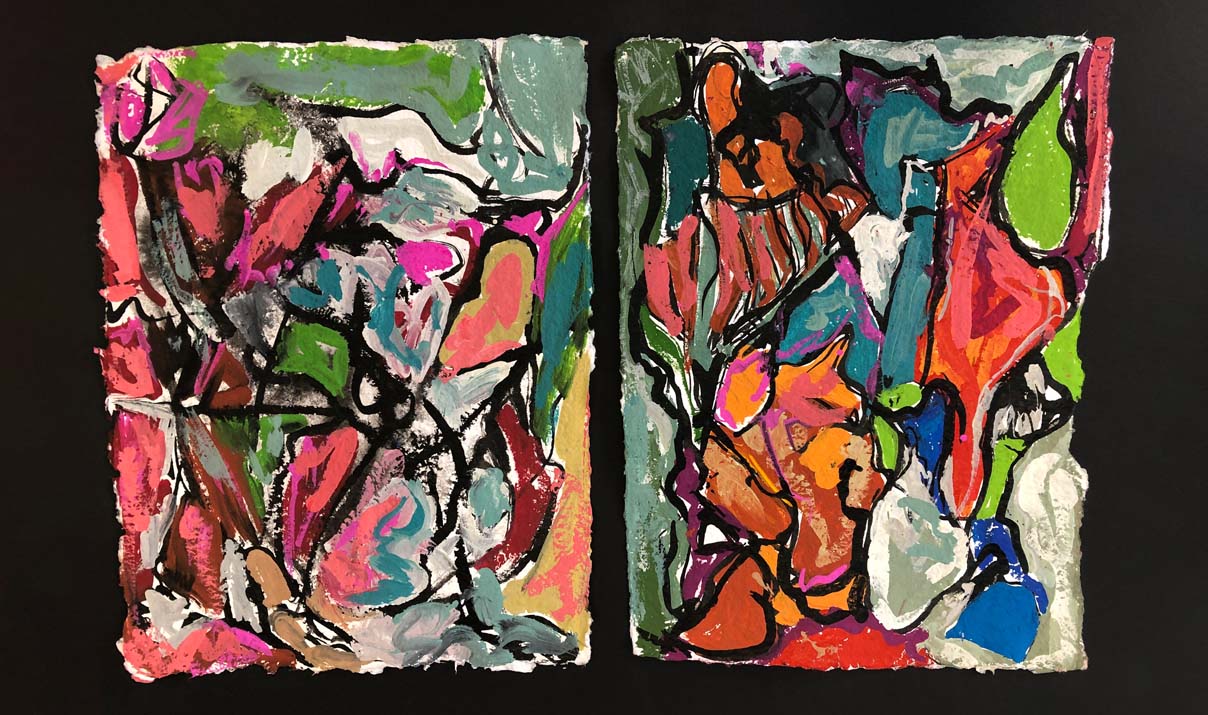 Gelvin, Origins - During this current climate of war, disease and anxiety about the future, I returned to materials and symbols originally explored when my body created life. Now I am fortunate to have another generation creating life. These intuitive human symbols presented themselves to me again and I felt compelled to express the inner peace, chaos, hope and uncertainty of birth and death. Using texture, form and color, I recorded how the world feels both fragile and indomitable to me and how this is confirmed more and more clearly with each passing year of my own life.