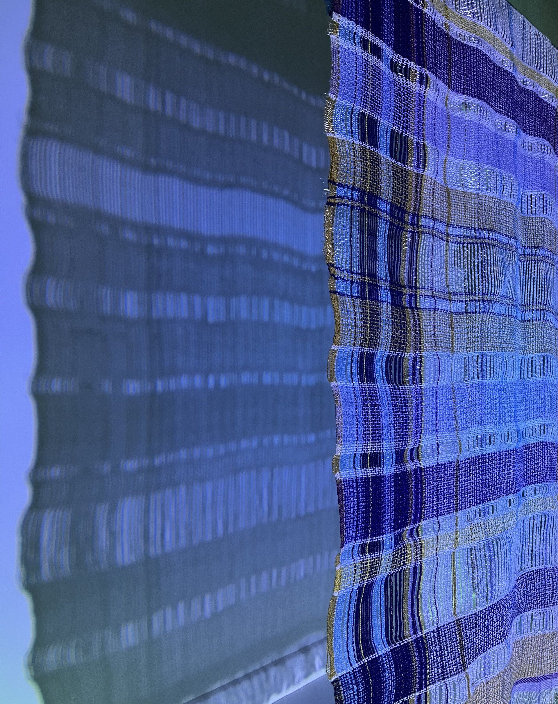 Amy Stevens, A Snapshot of Colour - Hand woven textile piece created using hand dyed silk and monofilament to explore colour and transparency in woven textiles. My project focused on creating installation work for public space on a large scale. ‘A Snapshot of Colour’ captures colour from my outdoor surroundings and personal photography composing them within bands of woven silk in mock leno structures. Monofilament compliments these samples giving a varied level of transparency which allows shadows to be cast behind the piece when projected with coloured light. This creates an atmosphere across the whole space which can be enjoyed by all the viewers to resonate with their own snapshots of memory.