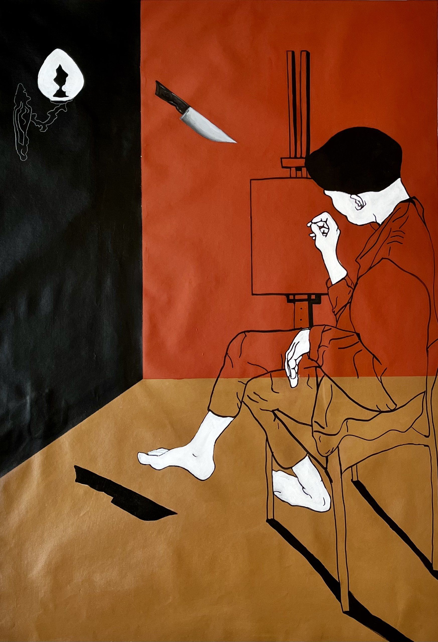 Aarushi Fatehpuria, Street Vendor - This piece is a part of an ongoing series of mine involving the idea of the human form being a constant subject of movement. I’ve always viewed myself as an action, my body never sits still and I feel everywhere at once. Overlapping limbs and harsh foreshortened angles help me dramatize this feeling and opens a gateway into understanding these experiences more. My body never feels present which is a fight I have to deal with daily, making art about this feeling is a way to stay grounded.