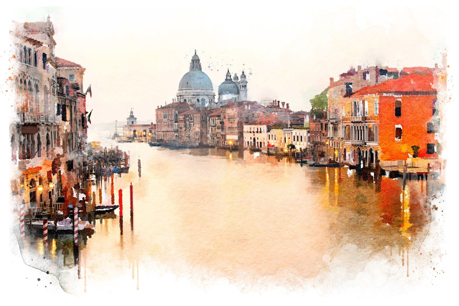 Wendy Baker, Grand Canal Venice - This art piece of The Grand Canal in Venice, Italy was created by digitally layering my original photograph with watercolor brushes to resemble a watercolor painting. I apply luminance with a light sprinkling of fine crystal glitter to the final print-- (Canson’s Infinity Rag Photographique).