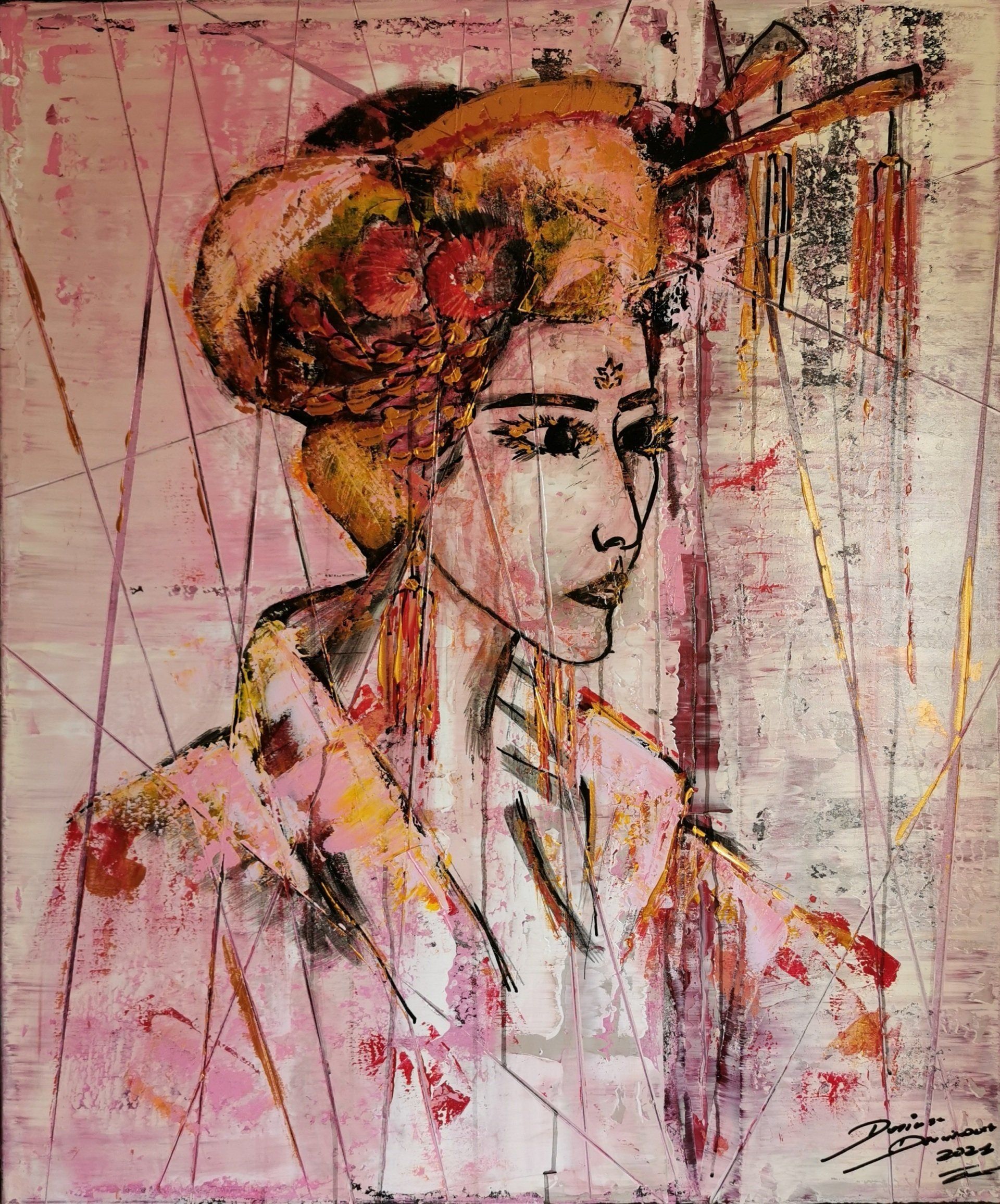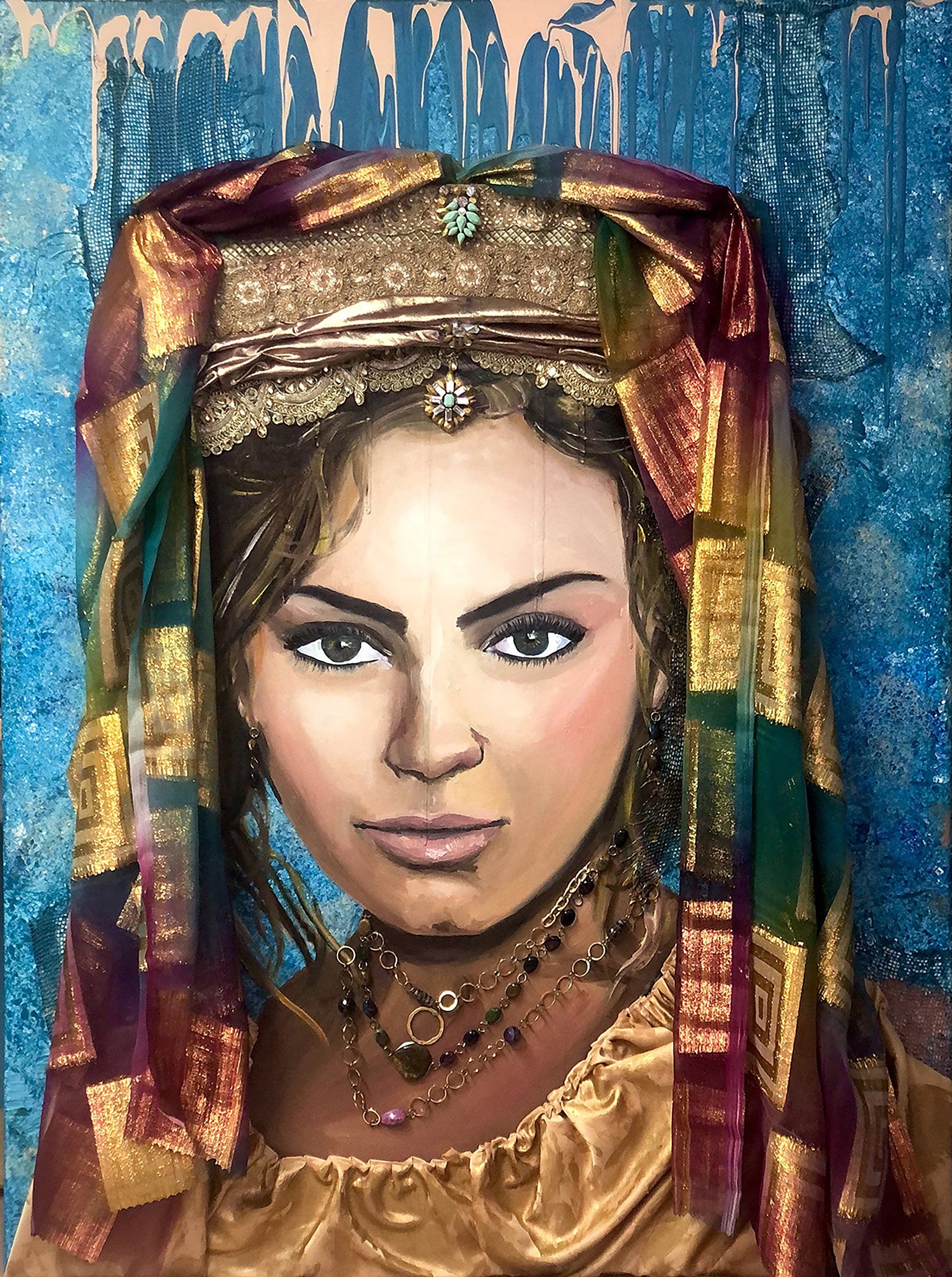 Ghia Haddad, Zenobia, Queen of Palmyra (from the Decolonizing History series) 100cm x 76cm mixed media on canvas- Ghia, February 2021 - Women in history have found themselves at the losing end of a misogynistic narrative. Women of color more-so, as they have had the misfortune to be seen through the patriarchal lens of history as well as an orientalist one; where their story -and with it their lasting representation- was fabricated to satisfy economic and political ends. I am currently dedicating my artistic endeavors to help decolonize our own image of ourselves - with the deliberate usage of mediums that would be considered “primitive” or “exotic”.