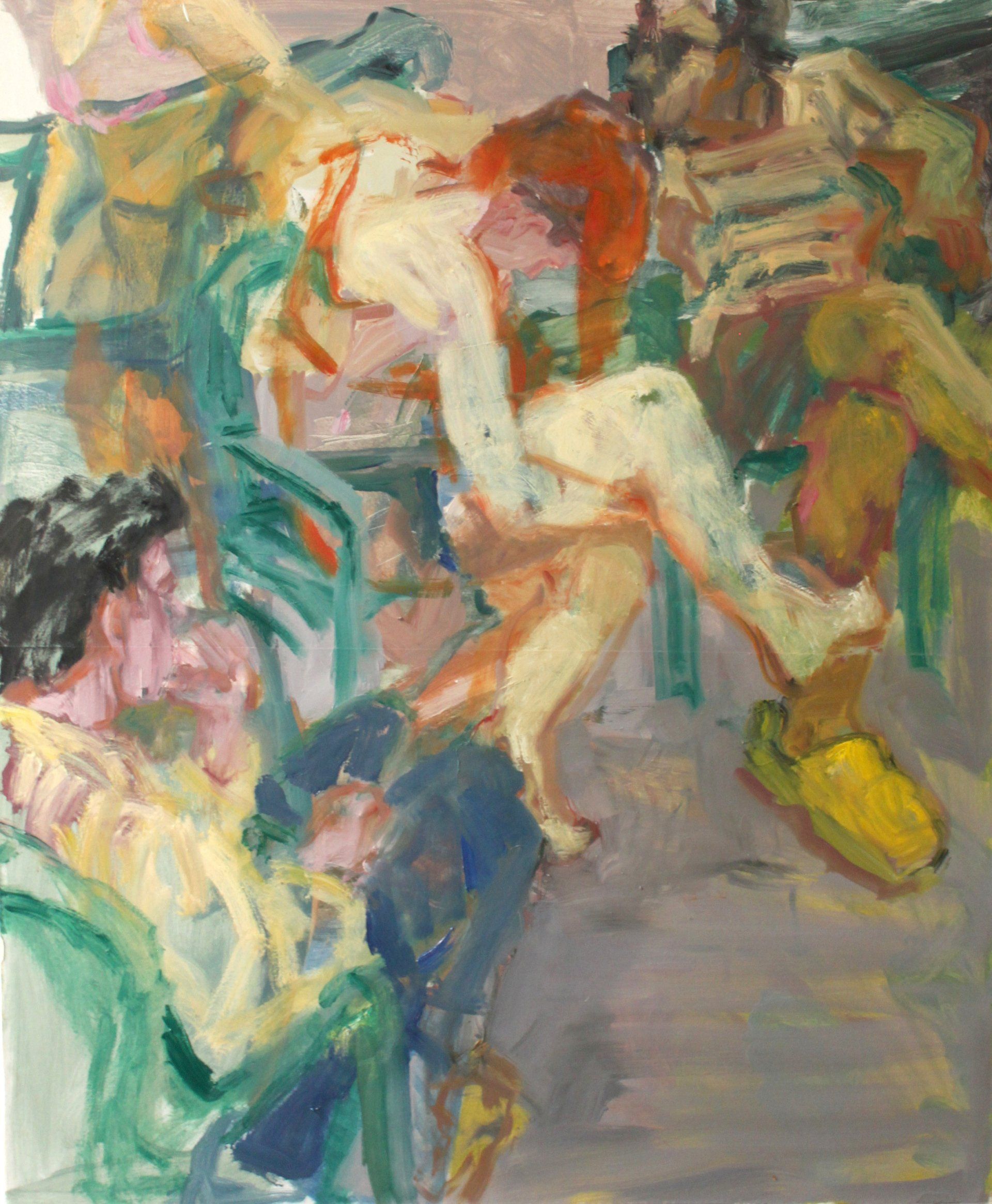 Rachel Mercer, Radiate Absorb - My paintings juxtapose everyday scenes and classical themes, the subject fades into the sensuality of the medium. The figures in my work move and dissolve across the canvas, creating a sense of disappearance and presence. This painting was made from a memory of friends sitting on a sunny patio.
