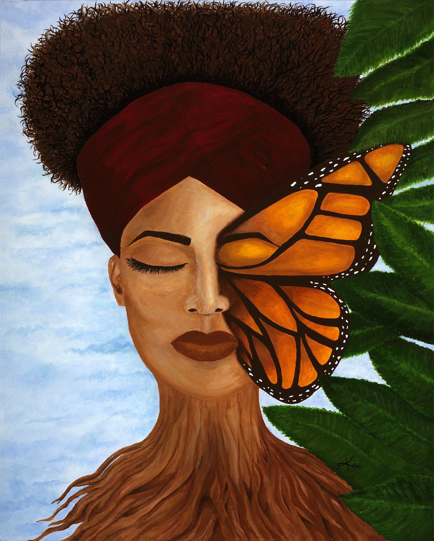 Ki Nichole, The Immortal Woman - This piece was created to embody the motifs of growth, eternal life and peace within a woman. The base of this woman was illustrated with the root chakra in mind to display the foundation for life. The Woman’s face was created as a half monarch butterfly to emphasize the spiritual influences of reincarnation and represent strength, endurance, spirituality, transformation, and evolution. The woman was specifically painted with her eyes closed to personify peace in her solitude within her existence. Her hair and hair wrap is a tribute to royalty when a symbol of authority wears a crown as their headdress.