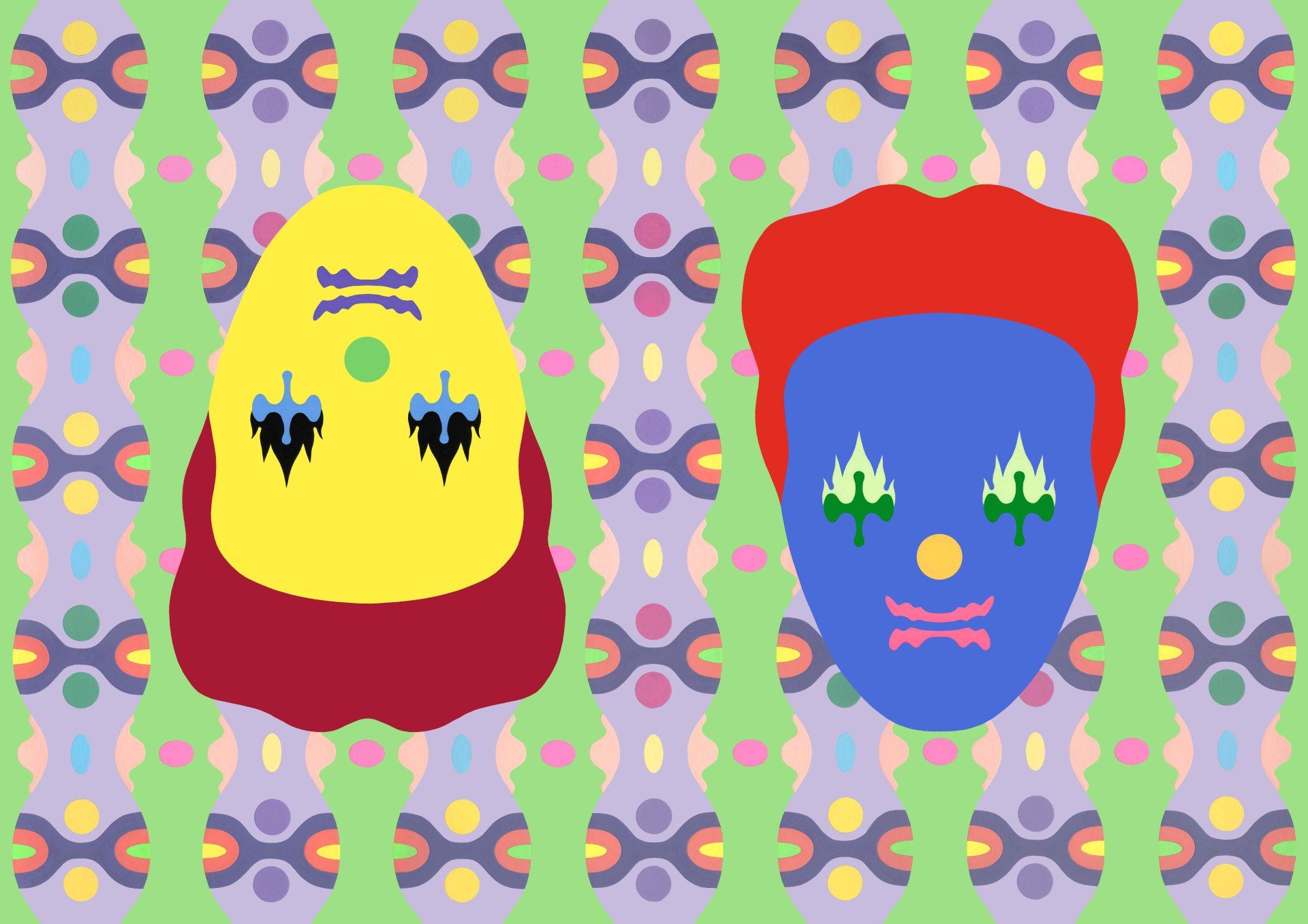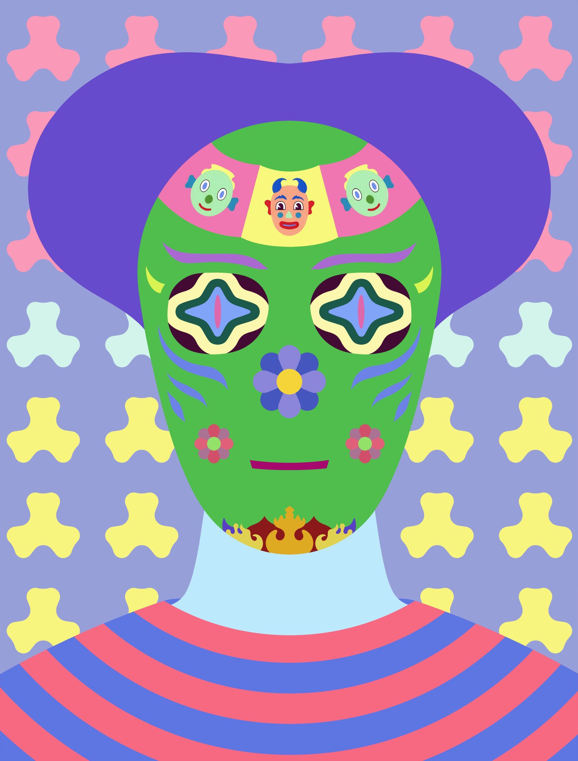 Lou Patrou, Green Barney - Green Barney is one of a series of six paintings completed in 2020 called the Barney & Betty series. They are loosely named after Barney & Betty Hill who were abducted by aliens in 1961 in New Hampshire. There are three Barney versions and three Bettys in the series. All are the exact same size, 30” X 40”, acrylic on watercolor paper. I spent just over two years working on them, from developing the concept, the backgrounds, design elements and the color schemes.