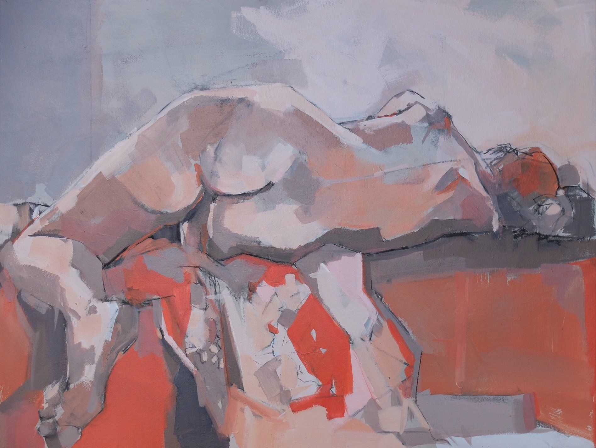 James Thompson, Figure in Repose - Acrylic on canvas. Completed in one sitting. Using a limited Zorn palette I work directly from life and as such, I work with haste. 20+ years in advertising lends my work a graphic style, with a strong sense of line. This figure was captured in repose, perhaps even asleep.