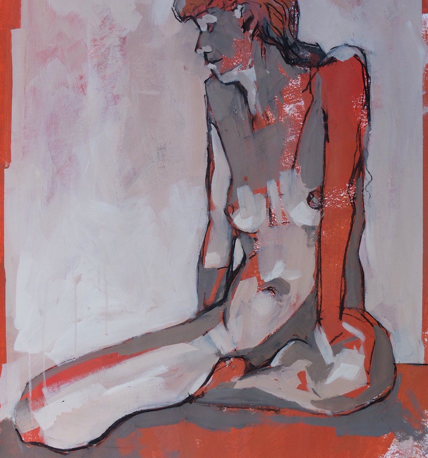 James Thompson, Seated Figure - Acrylic and charcoal on paper. Completed in one sitting, from observation and against the clock. In this piece the burnt sienna ground does most of the work, supported by my signature line work and slightly more than a whiff of Schiele.