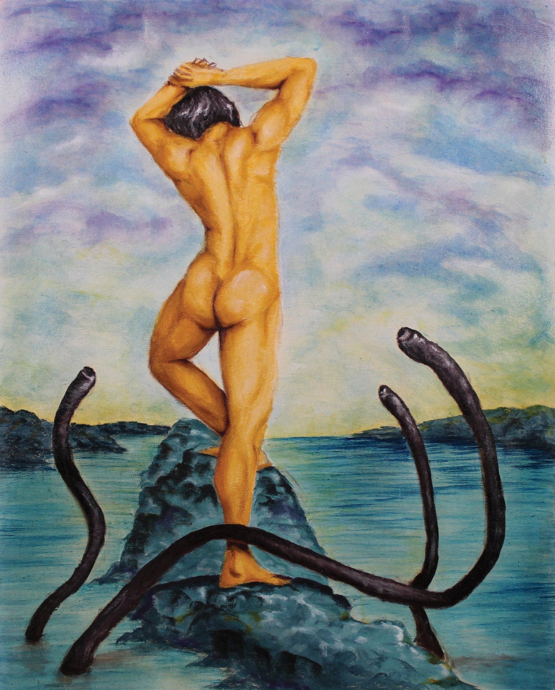 Edward Ficklin, Offering 1: Water, a tentative resolve - A passive male figure is not unheard of in Western art, but passive in the form of a willing offering of themselves is not so common. It’s something I wanted to explore more in this work (and two more in the series). While the offering could have taken the form of something more mundane like a religious or political allegory, I wanted to instead go deeper. What if the offering is being made to something inhuman, otherworldly? Well then you have the subversive thrill of a male figure, usually associated with control and power, willingly giving in to, seeking union with larger elemental forces.