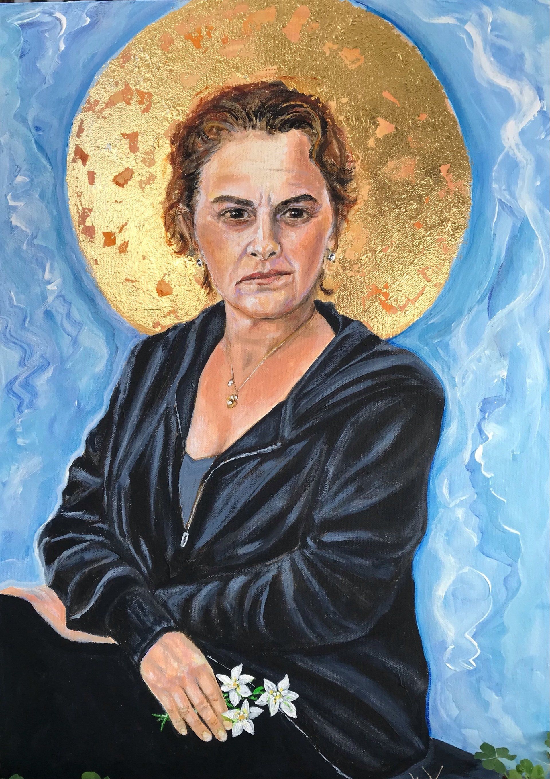Louise Hynes (Lula), Icon, Flower of Hope - Tracey Emin is the subject of this portrait . Love her or not, she has become an icon in the art world for our times . From being a wild young art student to a woman now dedicated to investing and providing opportunities for artists in her home town of Margate , fighting and recovering from a terrible cancer and never giving up hope for a better future for herself and others . The white flowers she holds symbolise hope . Something we should all hold on to in these confusing times .