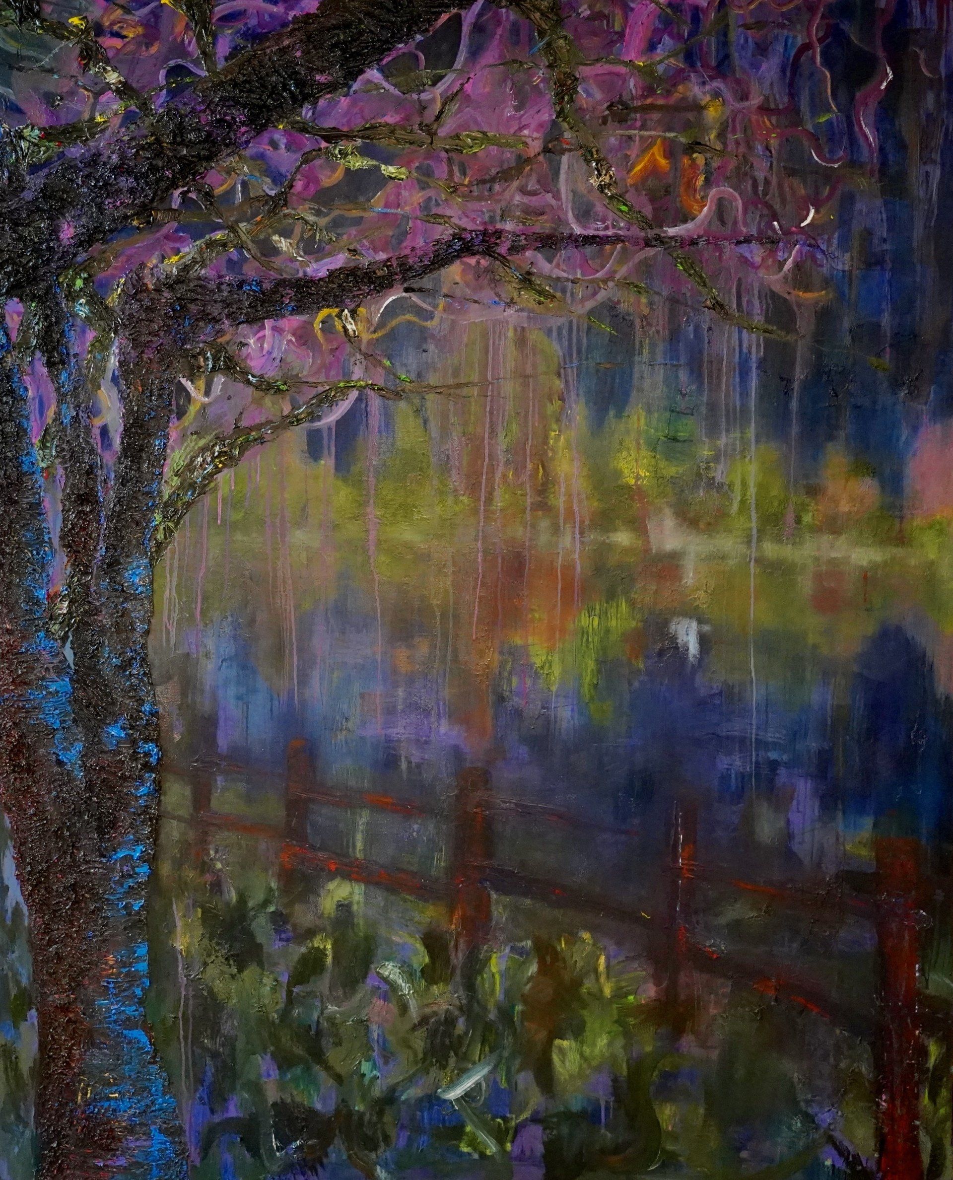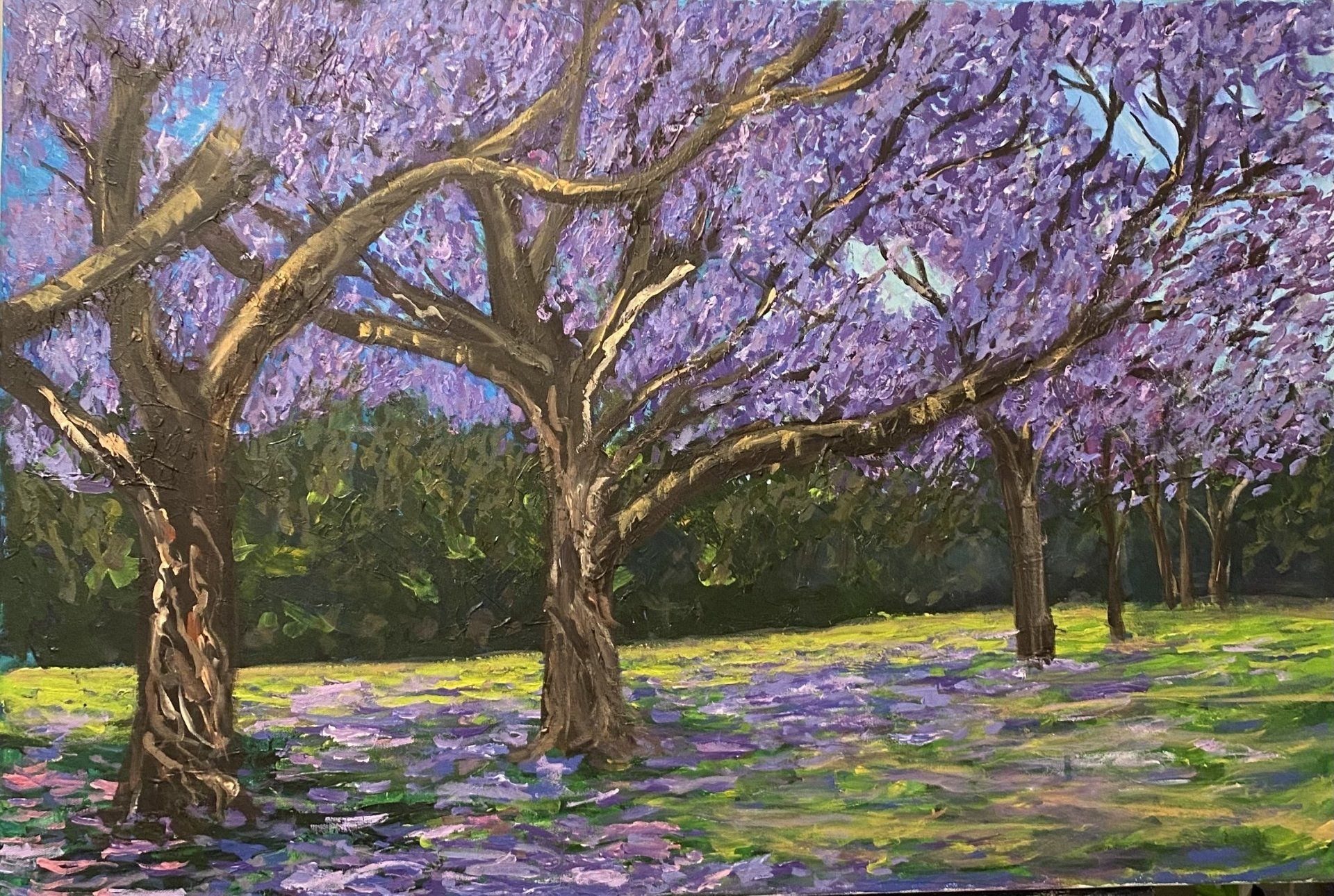 Noreen Walsh Art, New Farm Jacarandas - My artist’s eye is drawn each spring to the poetically beautiful jacaranda tree which is an iconic symbol of tropical Queensland. There are few more stunning examples of this unique tree than can be found along the purple lined pathways of New Farm Park as they follow the meandering Brisbane River. The rich vibrancy of purple hues, combined with the unexpected shapes of the branches as they dance and weave around one another, focus the eye both upwards and downwards to the soft carpet of petals lining the paths. Truly an immersive experience to nurture the soul.