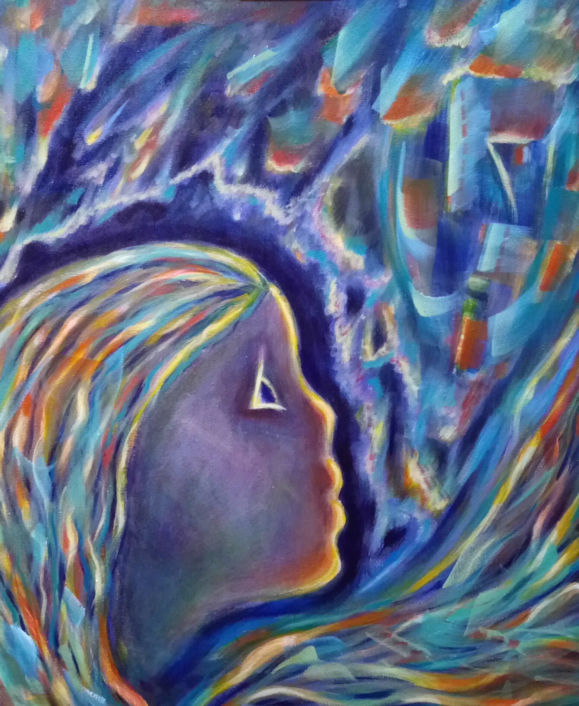 Lou Patrou, Traveler - Traveler, is an acrylic painting on watercolor paper, 30” x 41”, done in 2022. I was thinking of two things when I came up with the concept for this painting; time travel and the idea of timelessness of soul or spirit. Putting an upside down face in the piece was both a thematic idea (spinning thru time and dimension) and an artistic treatment. The premise is that the faces are the same being that is stopped in motion mid “travel”. The background represents the fabric and membranes of inter-dimensions and time.