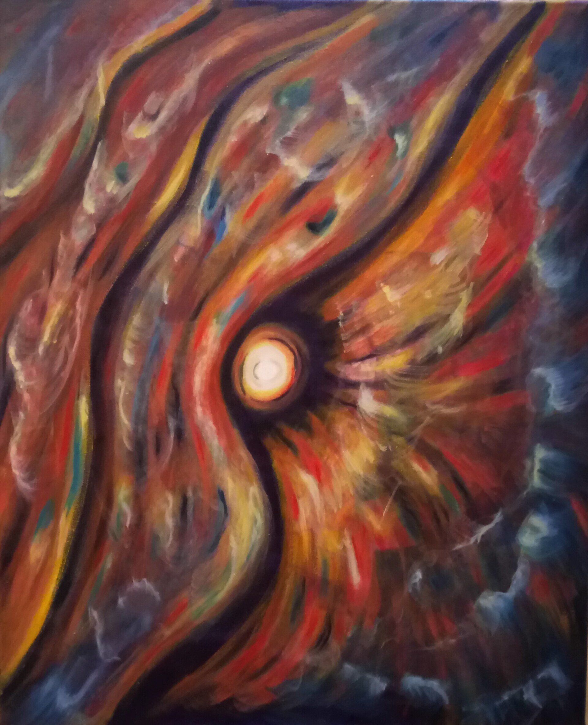 Maria Lopes, Wrapping a Dream - “Wrapping a Dream” sets a new approach in my art as an emergent artist. Using, for the first time, mixed media - acrylic and oil – I have opened a new path in my art. These two mediums give the work an explosion of color and texture, materializing the power of my emotions. The painting talks about my world of dreams and the need I always had to wrap them inside of me, reflecting the repression I lived so many years by not fulfilling my dream of becoming an artist. Dreams are deep visions that we should not repress or ignore for they speak to our soul.