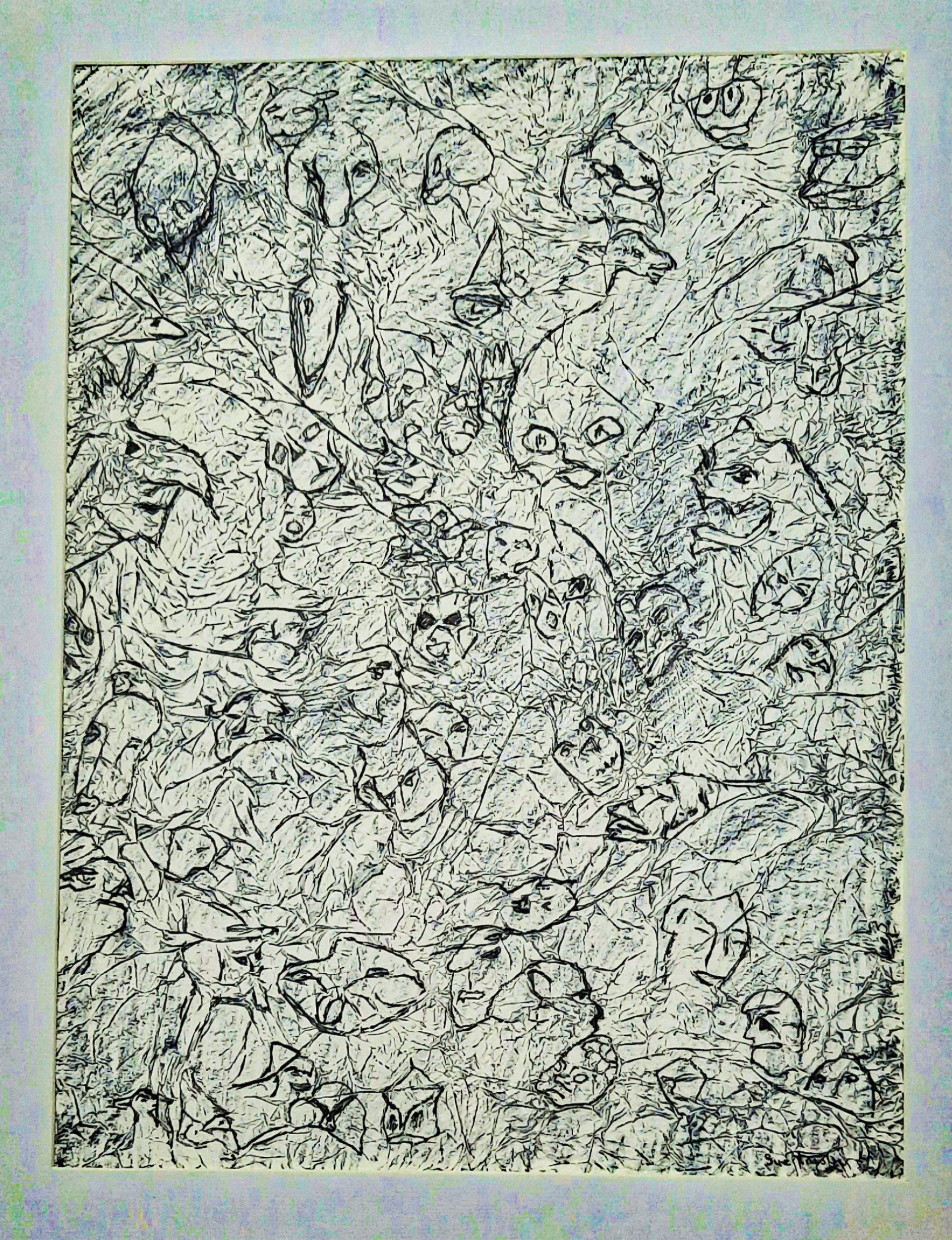 Sue Trusler, FEAR IN DARKNESS - began with a sheet of paper that was covered with acid free tissue, creating texture. Picking it up, I saw a face then more and more appeared. I later discovered Pareidolia is a psychological phenomenon that causes the human brain to give significance and facial features to random patterns. I became absorbed with the faces that continued to appear, the longer I viewed the random pattern. Some were quite grotesque, prompting the title of this piece, that literally created itself, appearing from nowhere. Selected for an Open Art Exhibition at Turner House Gallery Penarth. it has prompted a lot debate, opening up an exciting new style for me to explore. Sue Trusler
