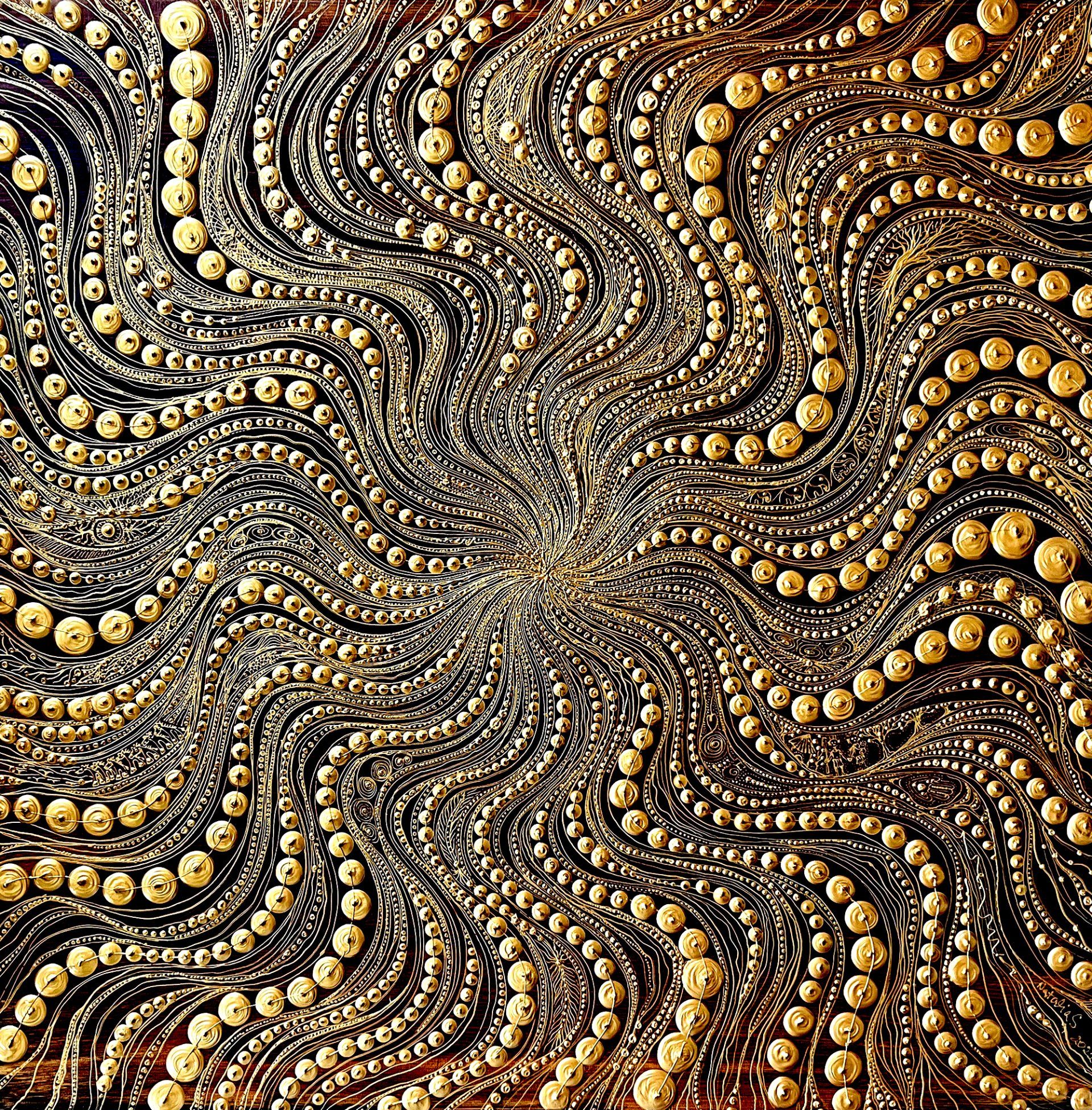 Alessio Bonini, Exploded view of Chromatic Extrusion 1 - The work is intended to evoke a plastic, sculptural action, the three-dimensional twisting of color in a space dimensionally outside the canvas. The gold and Indian yellow coloring is derived from association with the note B major of the musical scale, inspiring the viewer with a deep sensory experience. The artist desires the viewer to transcend to a state of complete symbiosis with the painting’s primitive gesturality.