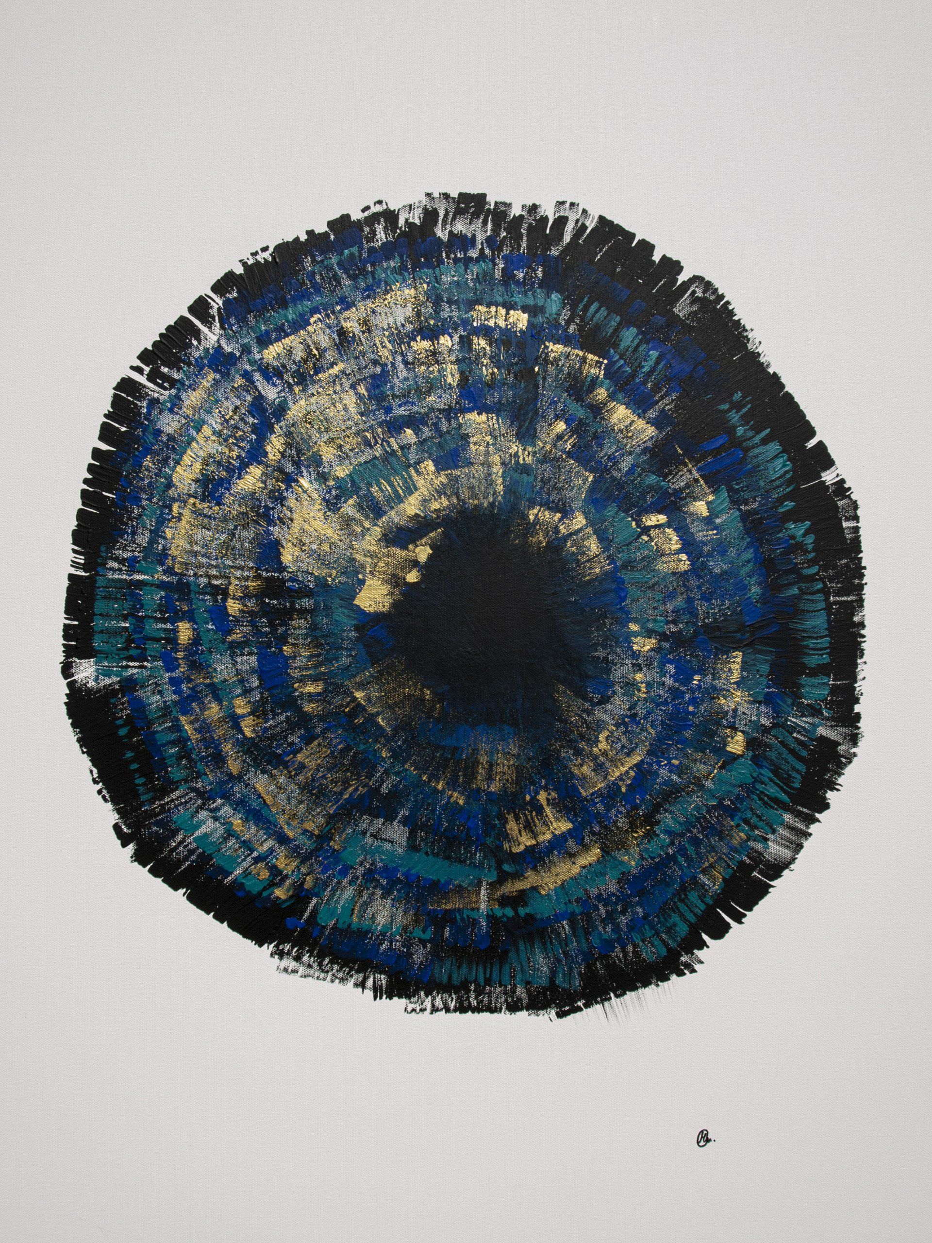 Mike McKeown, Something I May Never Find - This piece is part of my “Natural Elements” series, where I explore abstracted representations of objects and patterns found in nature and space. “Something I May Never Find” is inspired by telescope images of deep space galaxies which we’ll never actually see with our own eyes. Created with a stippling technique where the paint slowly depletes itself, the solid elements slowly break apart at the edges, creating a sense of impermanence. The title is a nod to song lyrics by musical artist Weyes Blood in her song “Andromeda”.