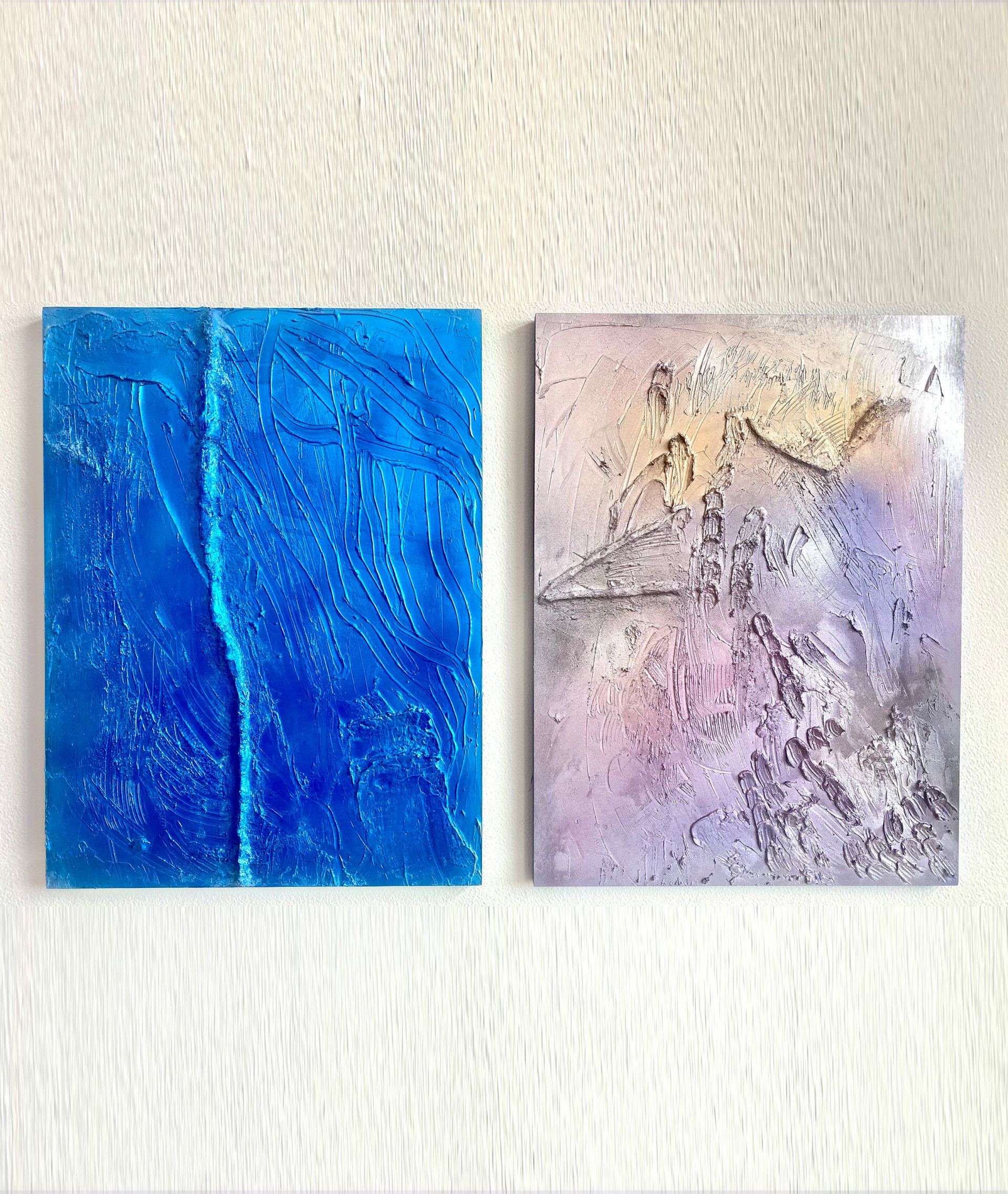 Anna Mathai, Fishing in a Kiddie Pool (Coasting No. 2) + Charcoal of Sophie shown as dyptich - Both Coasting No. 2 and Charcoal of Sophie are part of the artist’s metallic waves body of work. The coasting series touches on apathy and discontent in the corporate world— pulled into a rat race of excellence like a fish on a hook, while longing to just be ‘coasting’. Charcoal of Sophie is a summery piece inspired by the rainbow colored bird with the same name.