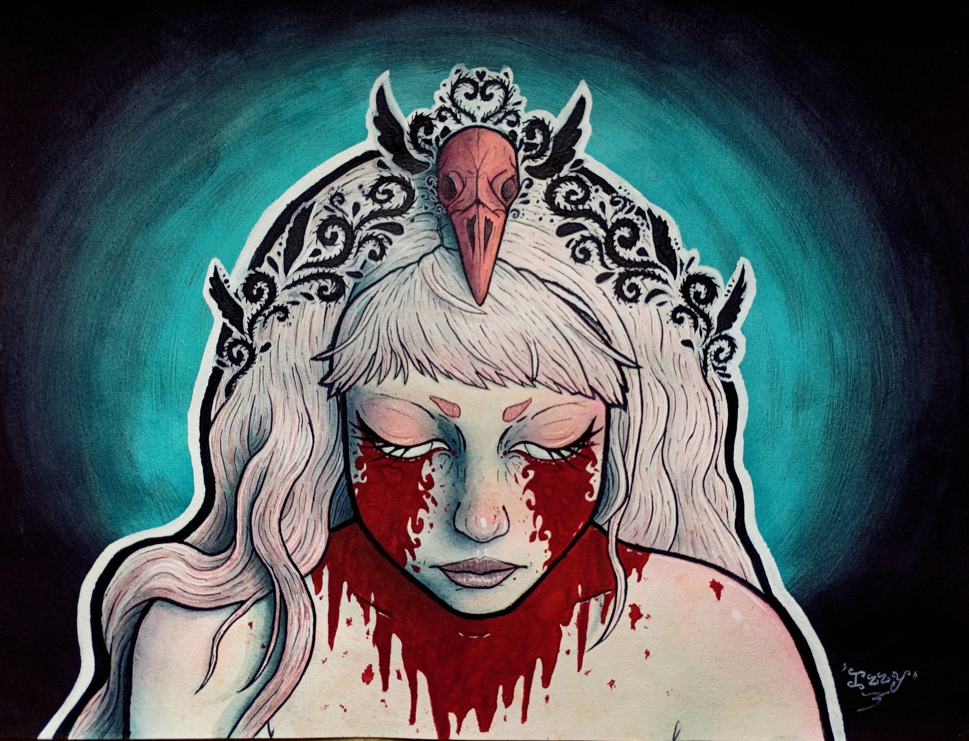 Izzy da Silva, Drama Queen - Have you ever felt like the others don’t understand you or your feelings? And that hurts so much, and makes it worse? “Drama Queen” is about that. This painting is inspired and represent my personal experience with this feeling that I have all the time, that I fell too much, I cry too much, I love and hate too much, that I’m too much, and then the other people give me this crow, the name is not what she really is, but what the people think about her. But my feelings are valid and how I experience life too, and so are yours! Don’t forget that! You’re not alone, and we are not dramatic.