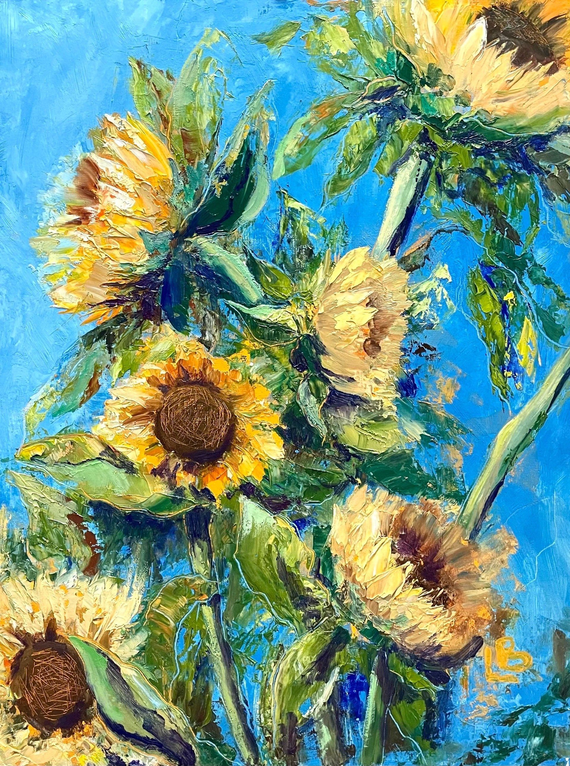 Lucia Boaghe, The sunrise, oil on canvas board, 45x60 cm -This work is part of a diptych, meant to show the beauty of life from different perspectives and time. Sun itself as a planet is the symbol of life, the energy that keeps everything alive on Earth. Sunflower fragile and ephemeral as any other flower is the symbol of love, devotion, optimism and peace. It turns towards the sun to capture the energy of love and every day is a new beginning. It forgets the night and is ready again to follow the sun during its short life. The sunflower has a special place in all cultures around the world from American natives and Inca to Greek and Chinese mythology.