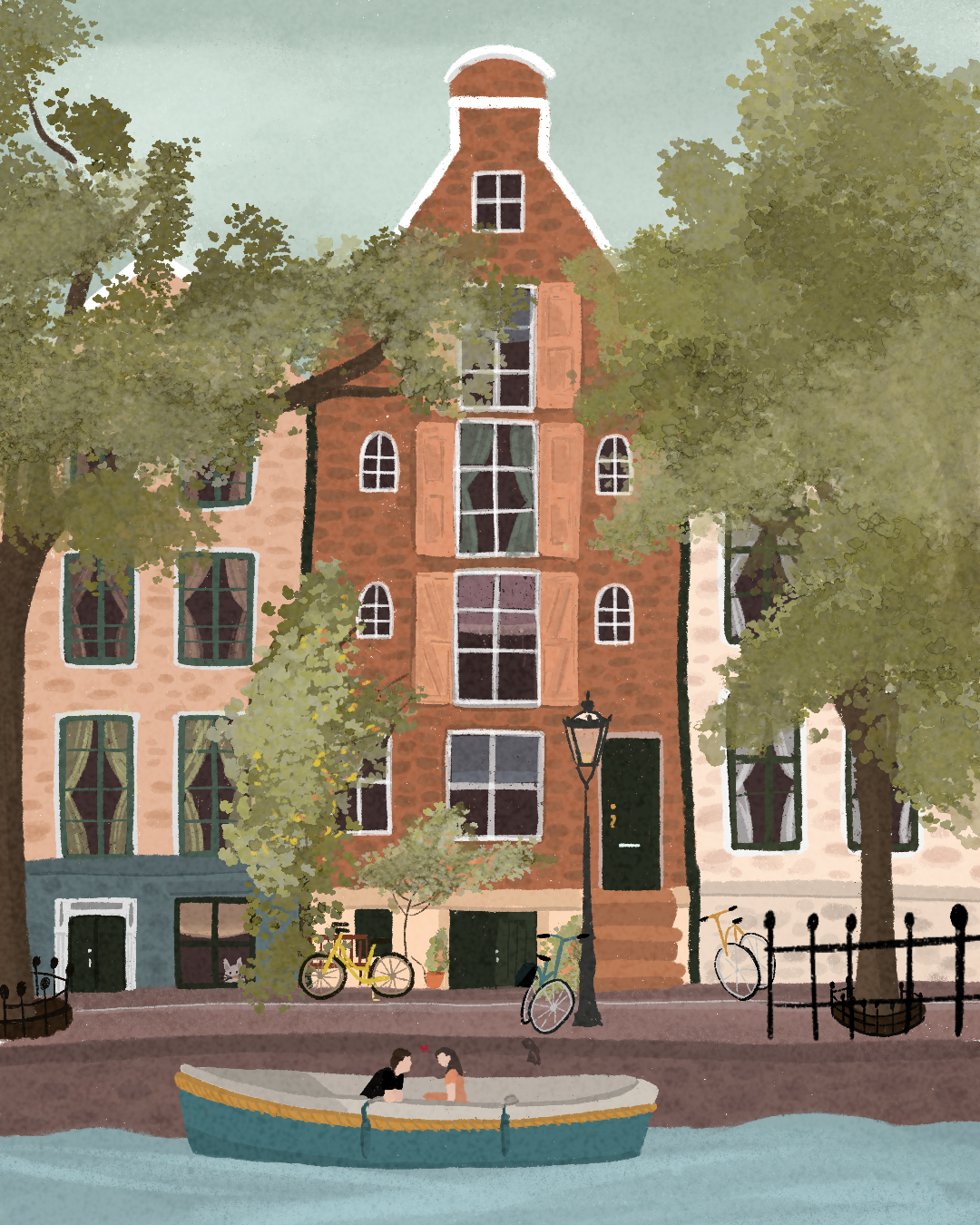Julia Paulina Gancarz, Love on a boat - I moved to Amsterdam back in October 2021. For the past almost a year here I have been here I struggled with finding any inspiration to draw. I started to feel lost and abandoned my creativity. But any artist can agree with me that you cannot just give up on what you love, so I decided to change my attitude towards this city and start capturing the daily life of people in the city. Right now I am talking about long walks and a lot of pictures that inspire me to show the good and bad side of Amsterdam through my art. This illustration represents specifically the simple joy of Sunday afternoon in Amsterdam. I wanted to capture the first days of spring and make someone smile.