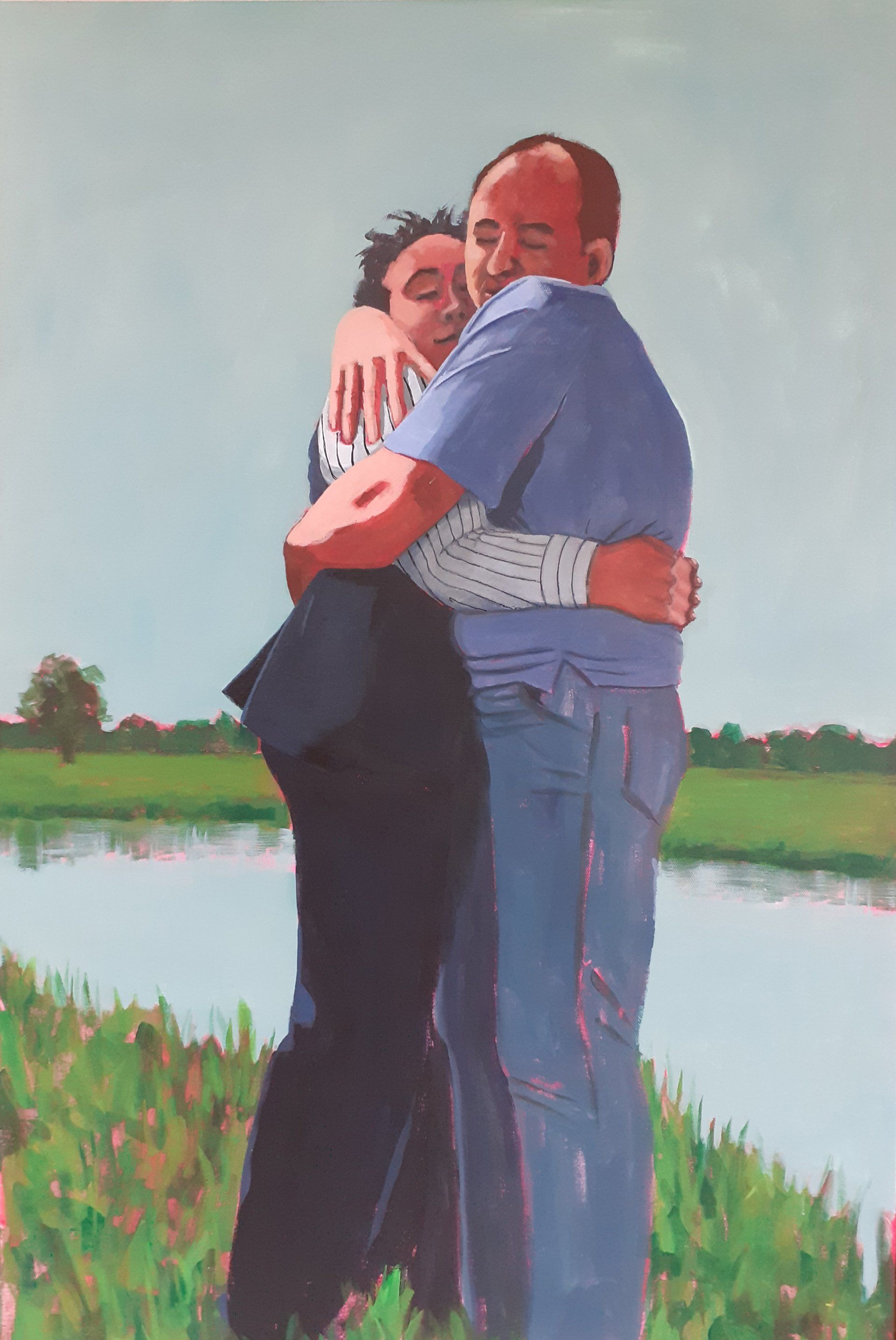 Sue Ransley, Mum Hugs - My Mum died over 28 years ago, but I can still get a sense of giving her a big squidgy hug. This painting was not intended as a portrait of her, or my brother – I haven’t attempted to capture their likenesses at all – rather, what was essential to me was capturing the sense of that squidgy hug. The all encompassing love and warmth.