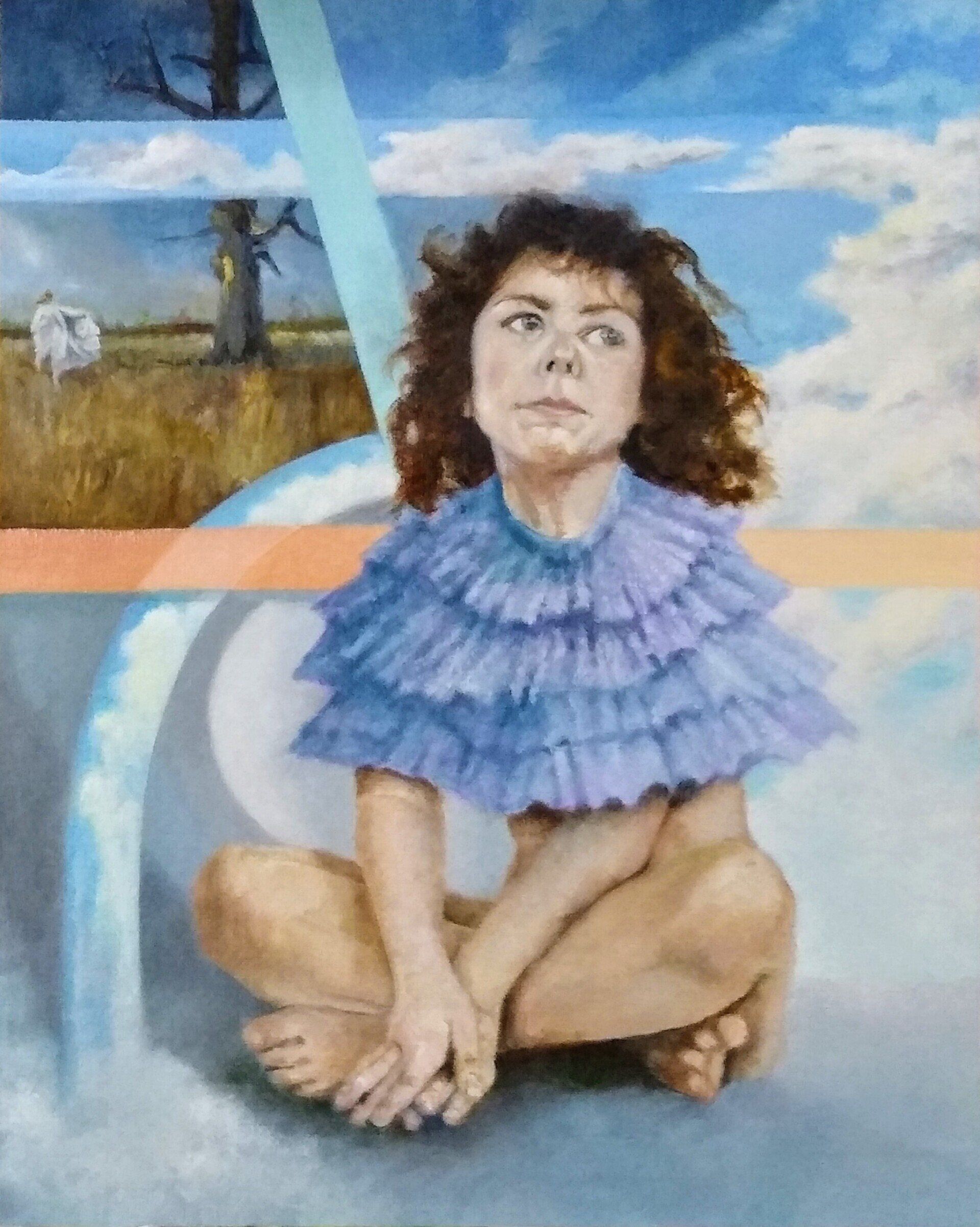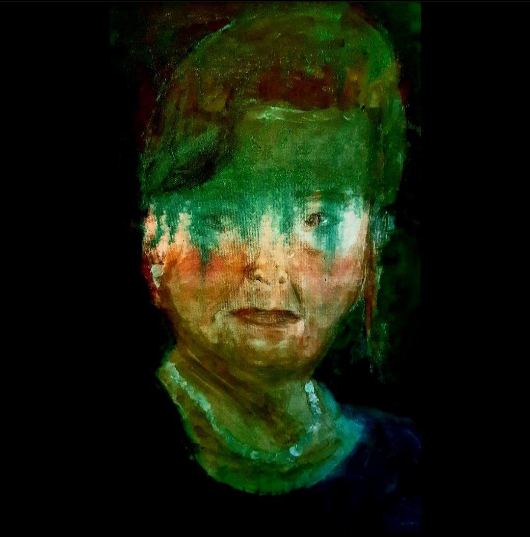 Iris Katharina Salzburger-Lindlar, Forgetfullness - A declaration of love to the mother was the aim behind this painting, created in early 2022, the creation of a small memorial for a living woman who is slowly losing her memories and who can only encounter many things in everyday life with empathy and a pinch of imagination. The constant, sometimes difficult, attempt to impose on her a world that is no longer hers. A time that also demanded a lot from me as ‘The Child Iris’ in the often brutal feeling of irretrievability of some thought puzzle pieces that now resemble a peaceful landscape, for example that of a carefree childhood. Before her alert mind threatens to sink completely into the depths of oblivion, I continue to proudly see her before me.