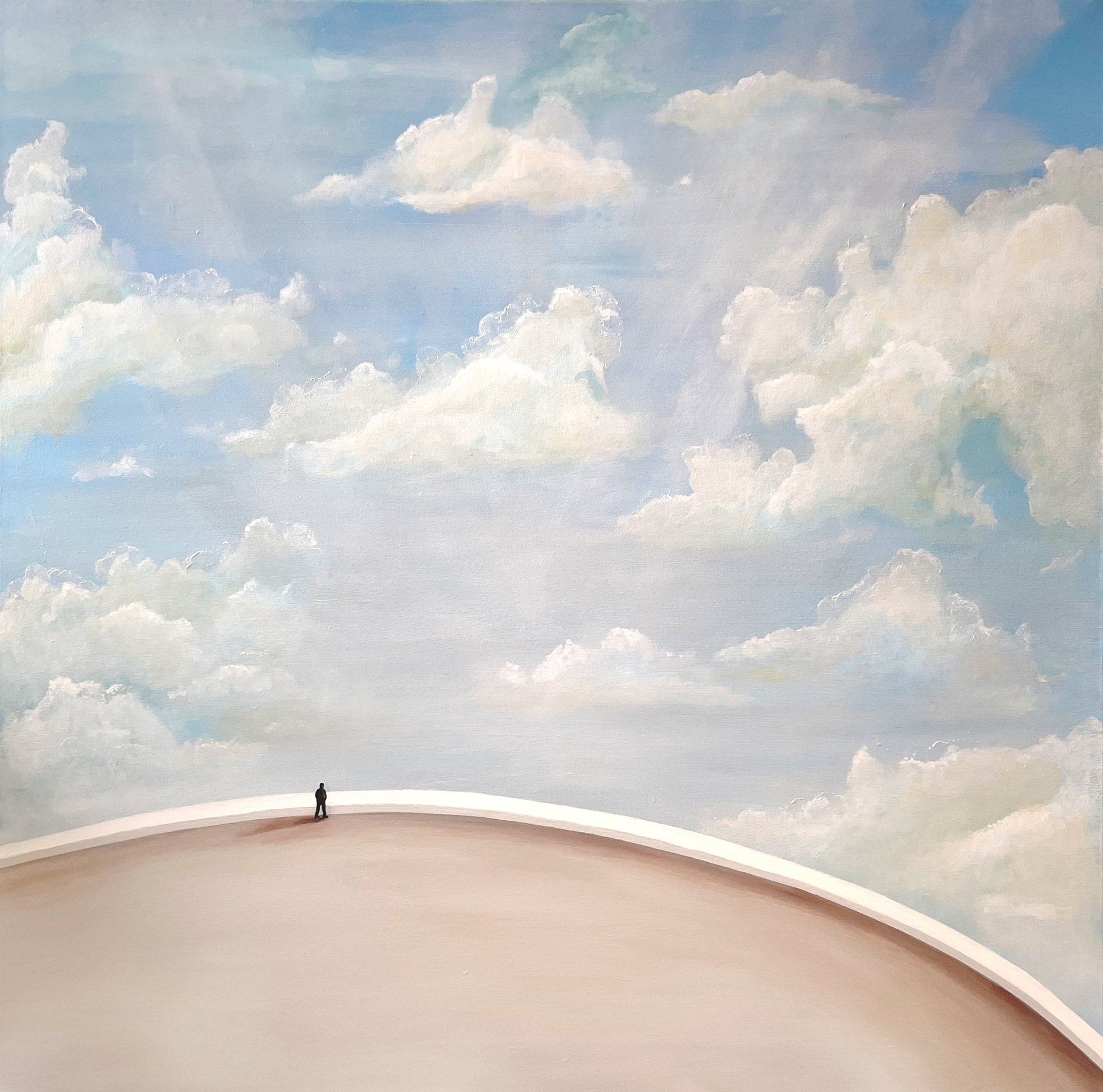 Maria Lans, Woman in the sea sky - A woman lost in the sky and the sea. Time and place, all turned around. What is up and what is down? Is there any straight line between time and ages or do we cooexist at the same time? Is our real face visible or is it all a theatre? Where is the core? is there any? We are stuck in a ground that is moving.