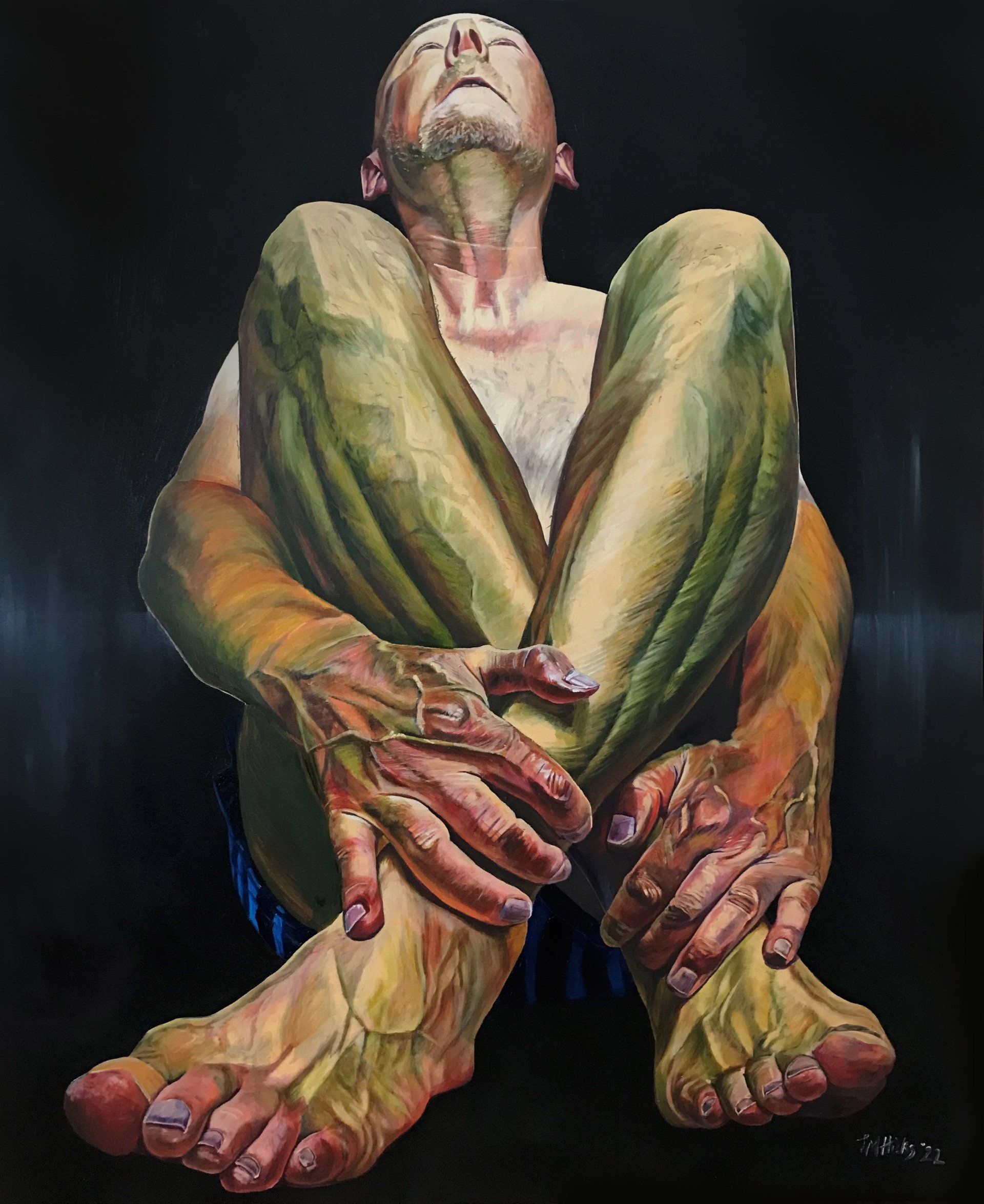 John Hicks, Under Pressure 18 - I’m John Hicks; Artist, Art and Photography teacher, living in Wales. I’ve been working on a series highlighting mental health. This theme reflects what I’ve witnessed in those around me over recent years. I’ve found painting these images cathartic and I’m told viewing is also cathartic for others. I have completed 19 - 100 x 120cm oil paint on canvas’ as well as many digital remixed of these images.