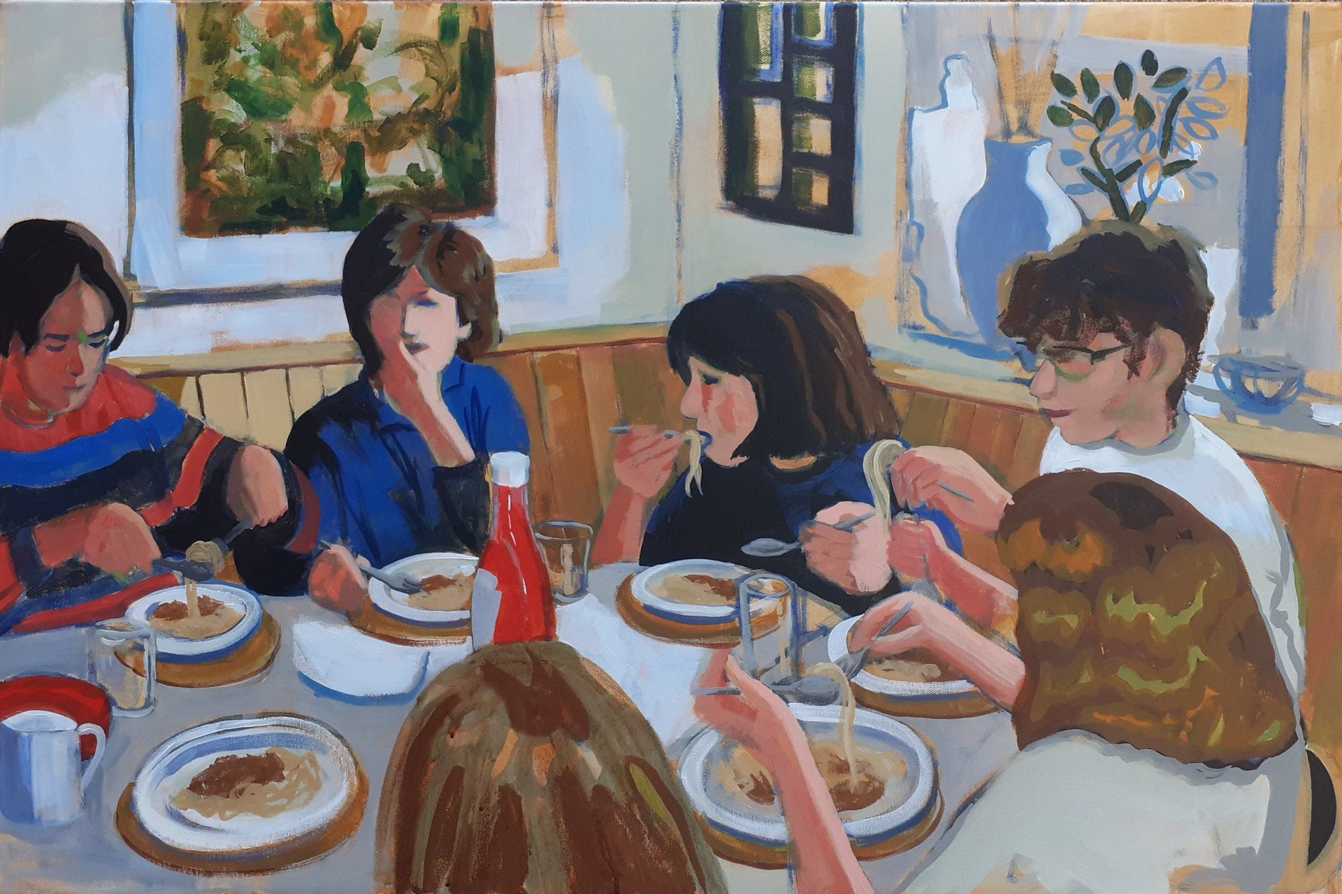 Sue Ransley, Friends Round Friday - Family life to us has always centred around our kitchen table. I want to feed people. I have to make cake if family or friends are coming round. So I decided I should celebrate that table, and acknowlege all the conversations that happened around it. The rows. The celebrations. The birthdays. The highs and lows of our family life. And this memory of one of my daughters with a bunch of her friends seemed appropriate – a big batch of Spag Bol had been made, and they were all chattering away, giggling, having a good time. It always felt a privilege to quietly be in the background pottering around, hearing all their chat. Those are important moments, as you learn how your children fit into their peer group.
