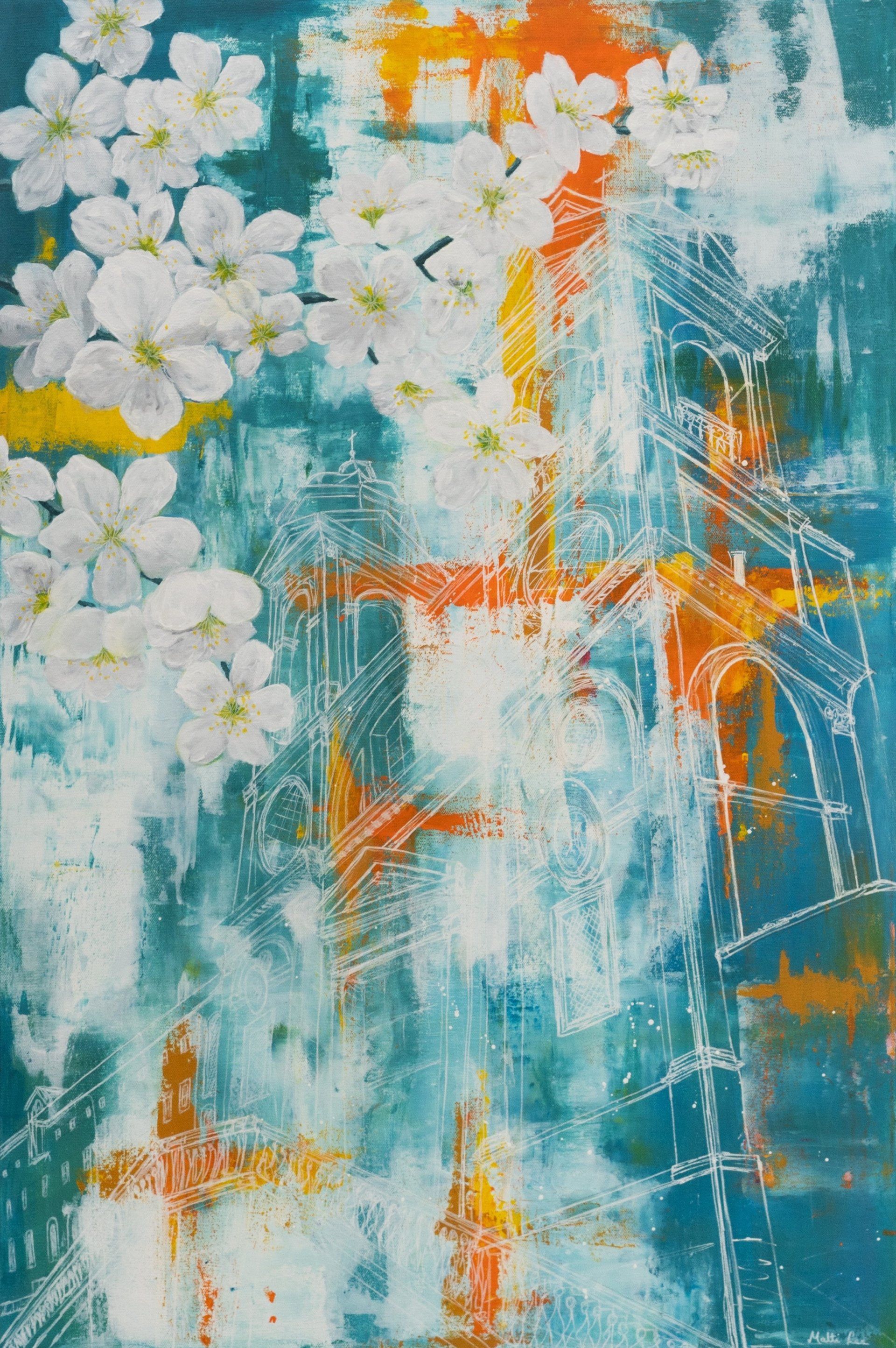 Malti B Lee, Strolling through Spring - One of my favorite things about any large European city is the beautiful sights you stumble across when aimlessly strolling through the streets. This painting is a nod to spring in Rome as I reminisce of my last trip to Italy. As I stood by the Spanish Steps at sunset, I looked up and noticed the details. In my creative practice, I leverage my experiences of living and working across Europe, Asia and America to explore nature in urban settings; in this painting, you see white blossom against the striking architecture of the church in the beating heart of Rome. Acrylic on canvas, 24 x 36 inches.
