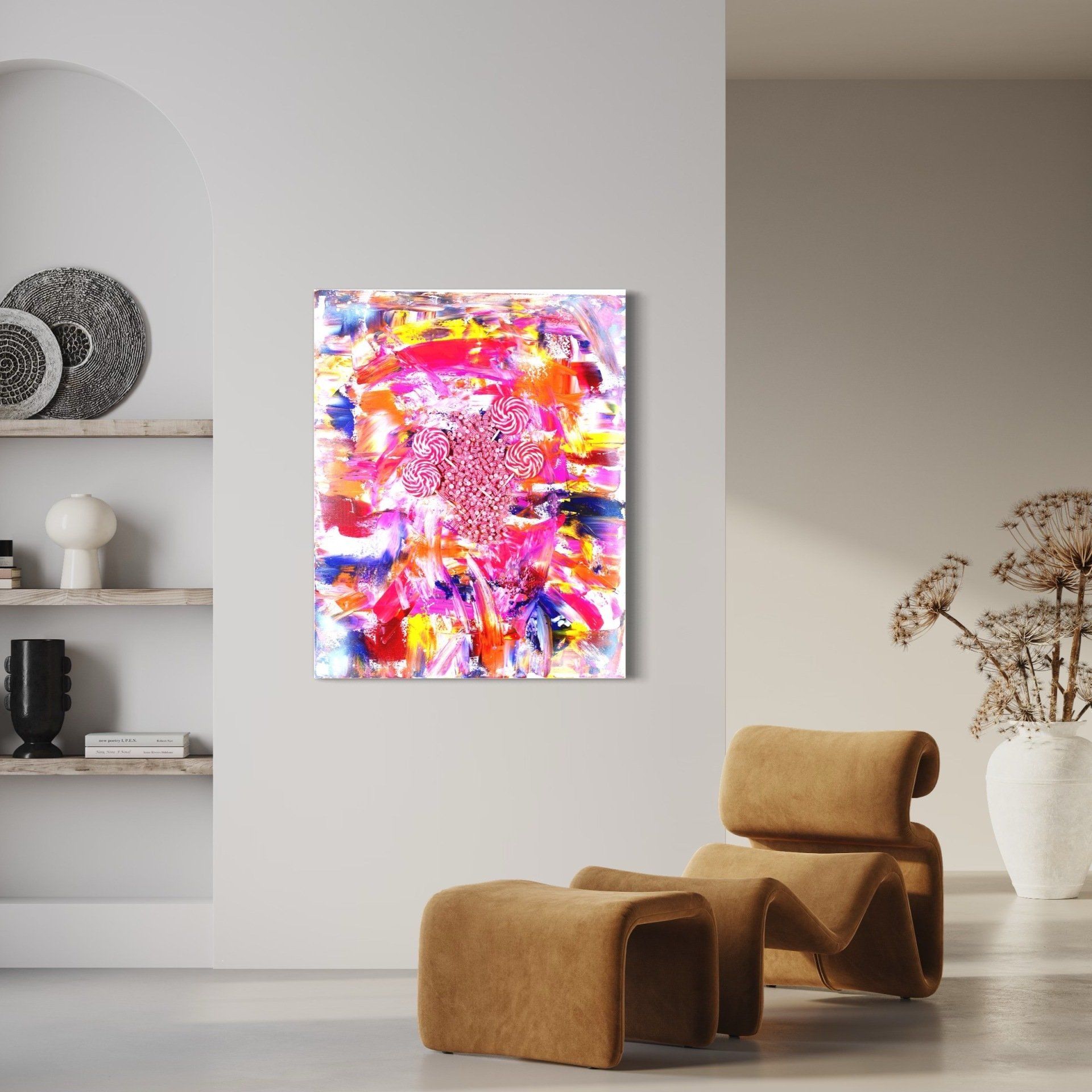 Denisa Elena Viulet, Childhood - This 3D acrylic painting represents a colorful explosion as a reminder of the childhood time. I tried to include the candies as the center of the artpiece because candies remind us always how to be a child again, and feel the joy as we never got old.