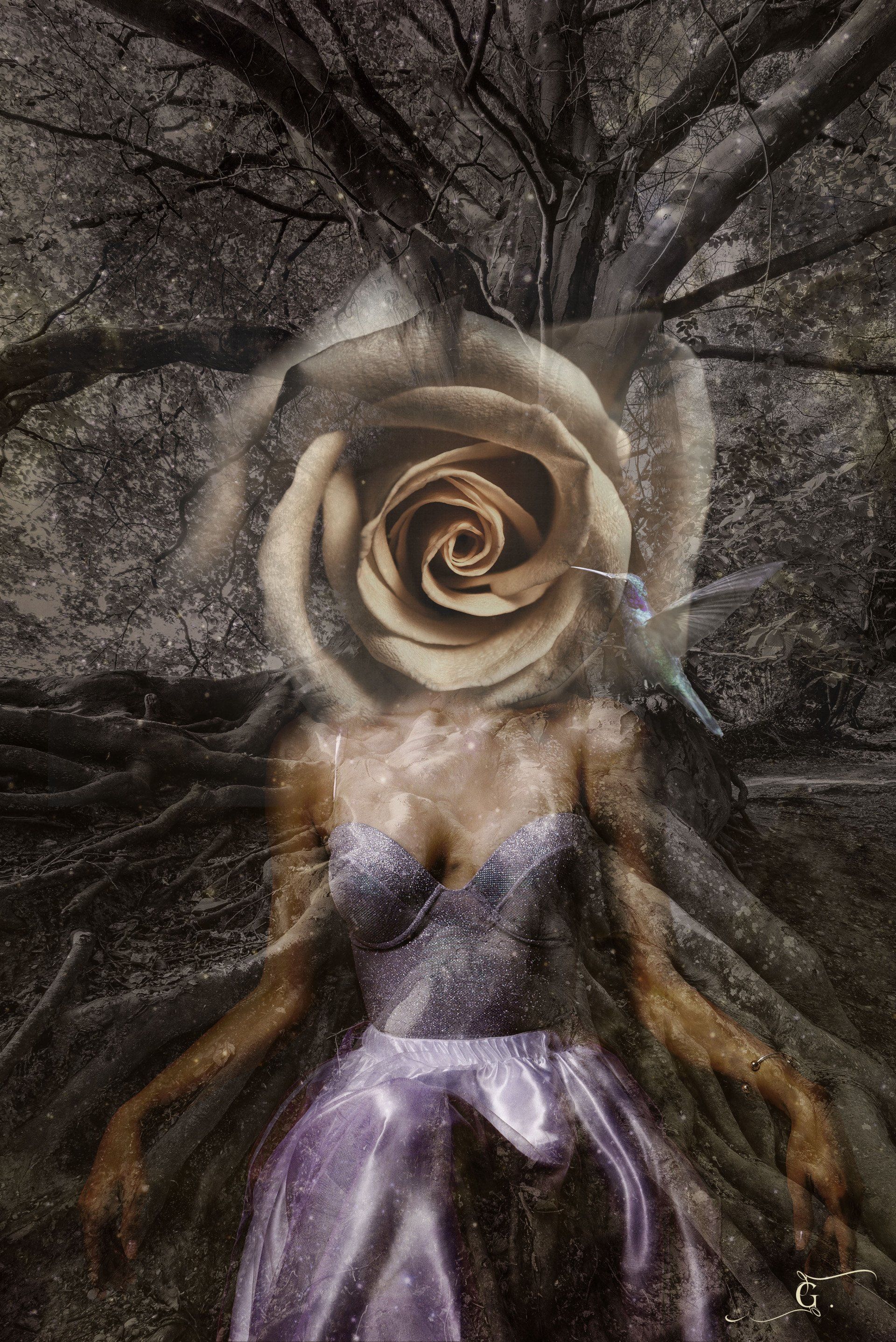 Giovanna Arancibia Marquez, Earth Goddess - “Earth Goddess” is a digital artwork created with Photoshop that enhances a woman blowing from inside out, sitting on a huge tree that symbolizes her throne: the Earth. She has deep roots which give her confidence and strength. The nature is a key element to her own anchorage and self achievement as it takes all the background. Her face has been replaced by a white rose, symbol of purity which means the goddess is showing her integrity and authenticity to the world. I decided to create a dark mystical atmosphere in order to emphasize her magnificence. Finally the hummingbird on the right, represents, in Native American culture, the spiritual guide that is attracted by this divine woman’s Rebirth.