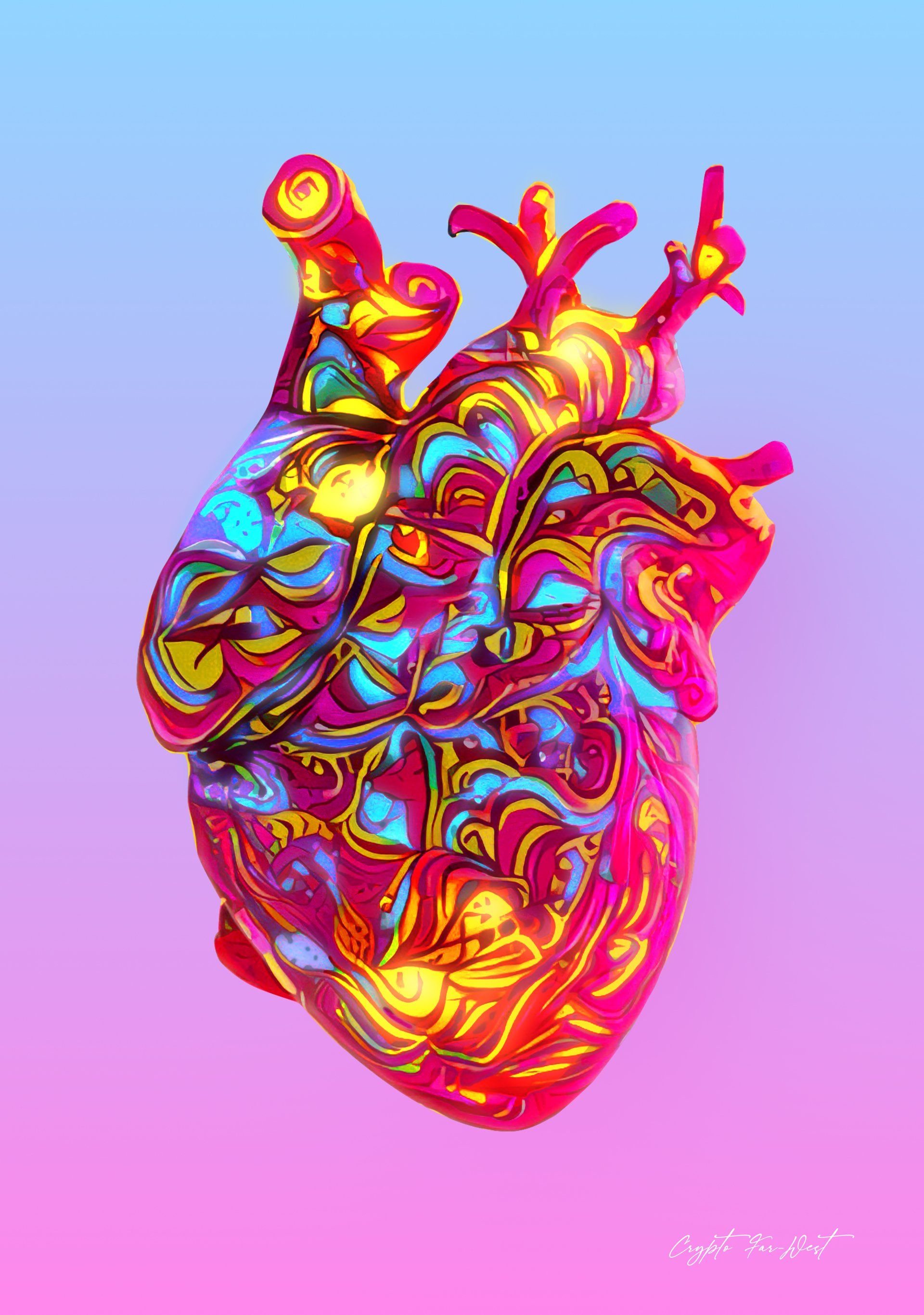 Crypto Far-West, HOPE - Hope is shown here as a heart full of life and light. This piece, which was inspired by the Pop Art movement, is the iconic figure of Crypto Far-West’s HOPIUM art collection. It is a visual and multidimensional conversation about hope, which is an infinite and powerful human resource. Hope which is shown here as a still piece of art, can also be seen beating and glowing in various videos artworks. One of them, minted as a Non Fungible Token (NFT) contains a riddle that only their owners can solve.