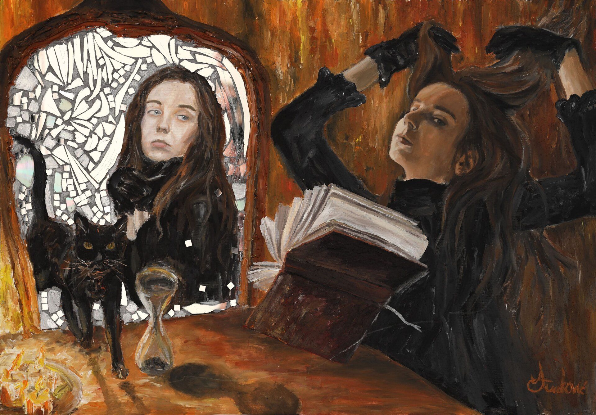 Andela Tucakovic, Through the eyes of Behemoth - Andela is a Croatian figurative painter whose theatrical symbolic narratives enriched by the language of mood in literature often reflect the idea of nausea of uncertainty through compositions that critically examine seemingly ordinary everyday life. The title of the work suggests the influence and the intermedial interpretation of Bulgakov’s masterpiece The Master and Margarita. The expressed duality of light and dark in all aspects is juxtapositioned through a double self-portrait, one showered in light, and the other in semi-darkness. Elusiveness is perpetually projected in the mirrors’ reflection, shifting as constantly as our emotional impressions of the transitory surroundings of the mundane.