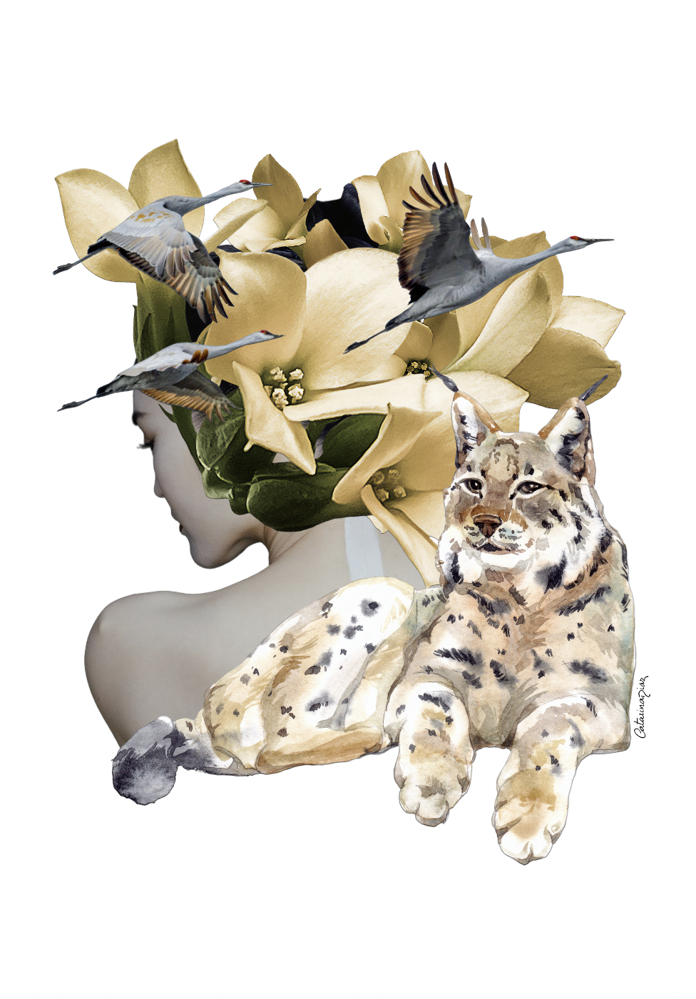 Catarina Diaz, Zenobia, Serenity - Only time allows us to look over our shoulders with the serenity that experience gives us. This female figure with oriental features symbolises this maturity. From the back of her head proliferate golden flowers and green foliage. Three cranes fly above them. They represent loyalty, peace and longevity, concepts also mirrored in the delicate profile of this woman. But the whole composition comes to life behind the image of a feline, which seems to observe something out of our sight. This lynx, a symbol of understanding, is the personification of the present as the female figure represents the serene and lucid look over the past, which will allow us to walk safely into the future.