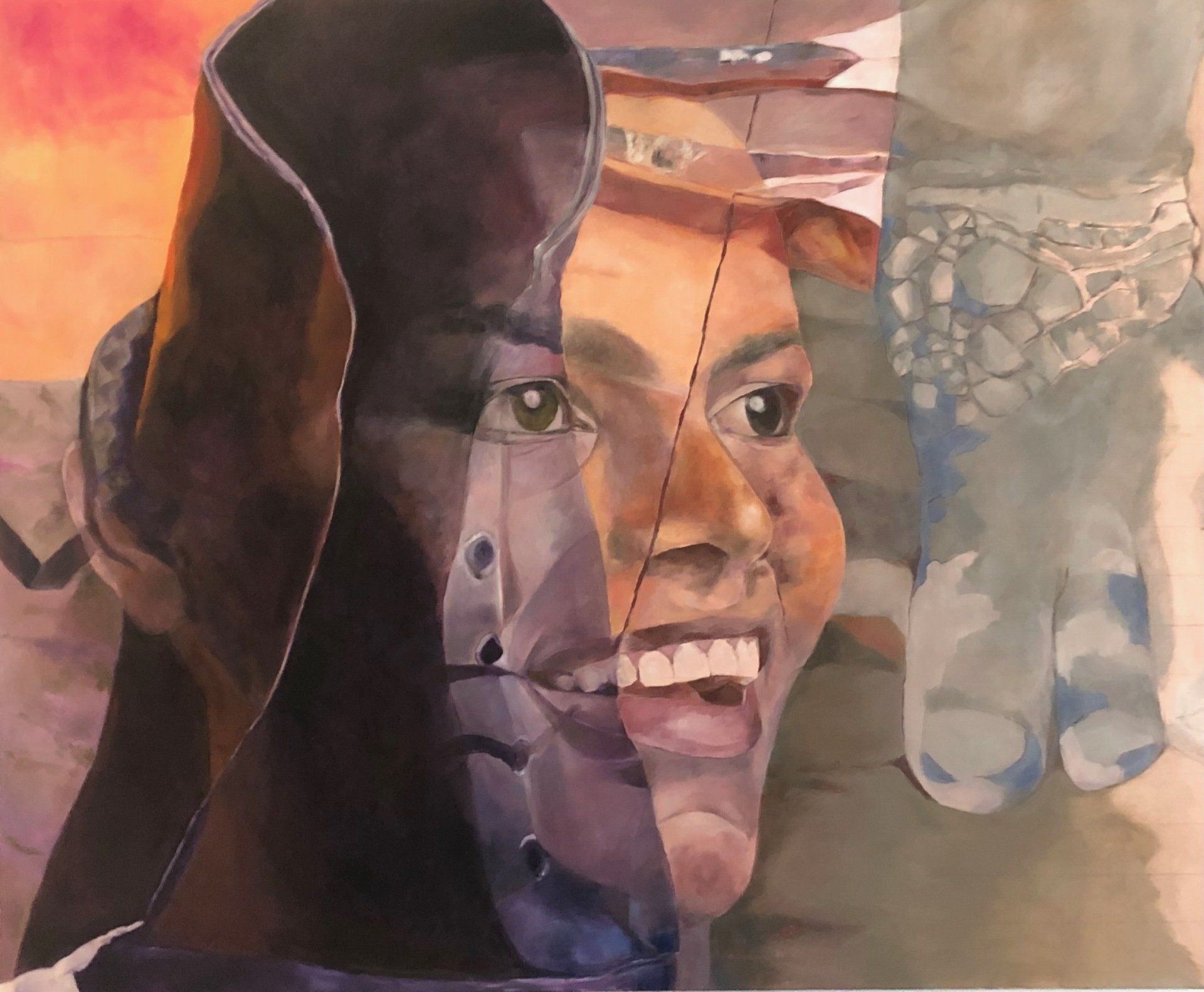 Devanshi Patnaik, Lacquered Scars - Lacquered Scars is a metaphorical portrait of who I am at the end of a year of hurting and healing. It is inspired by Kintsugi, the Japanese tradition of mending cracked pottery with golden lacquer, which creates a far more precious piece than the original. Likewise, the wounds we suffer become sources of resilience and personal growth, sculpting a sterling version of ourselves. My hope for this piece is that it serves as a reminder to own and honor the scars that truly are worth their weight in gold.