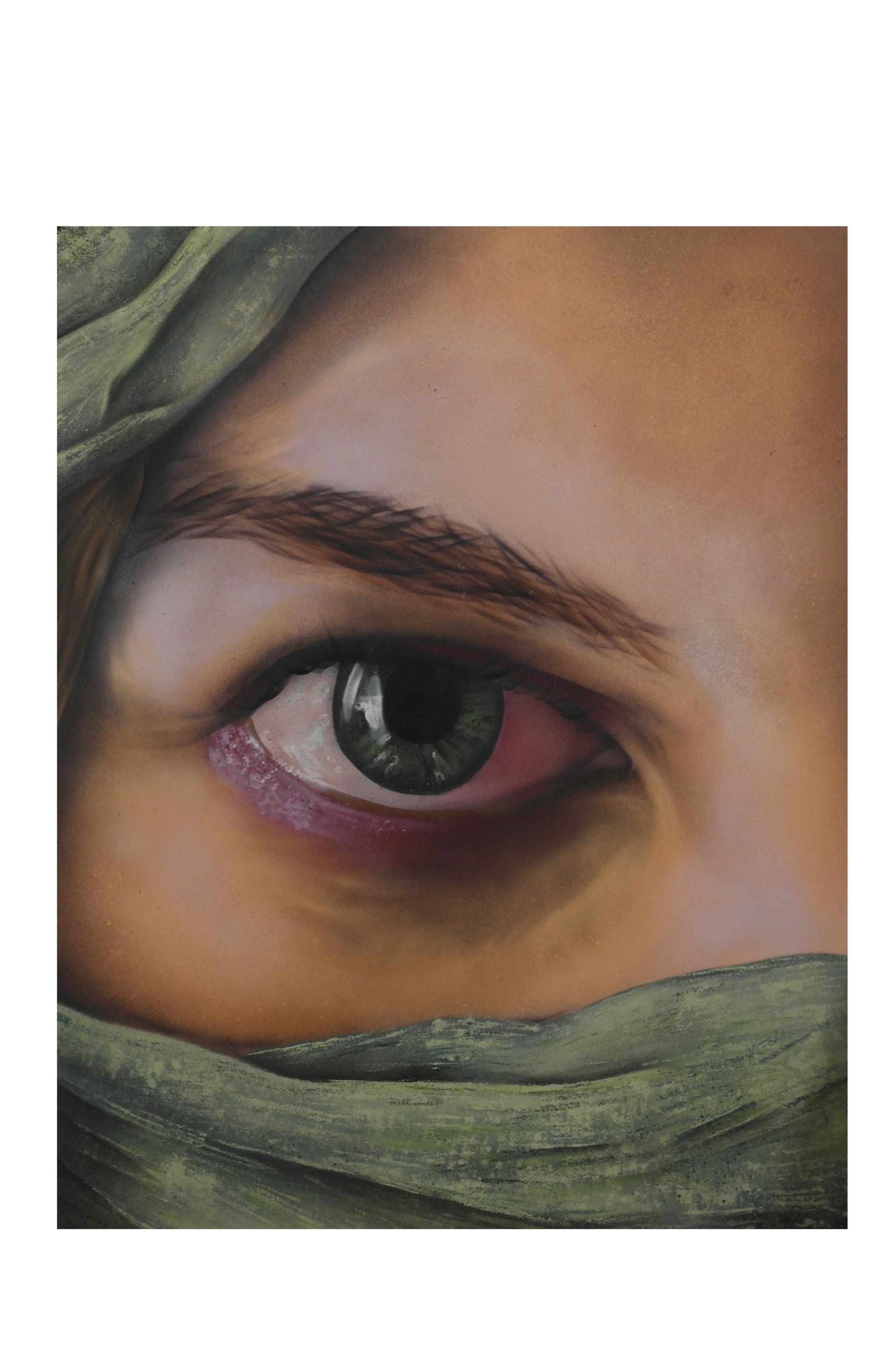 Nico Lattermann, Augenblick mit Tasso - This 90cm x 70 cm Canvas shows an realistic drawn Eye done 100 percent by spraypaint. Related to the culture of Graffit i asked myself what is possible to do with the Spraycan and , yeah.. thats it, didnt expected that. The Artwork contains a nice contrast betwenn the greenshades and the skintones, which works very smooth; contrasted by itself within the strong view of the Eye. To me it shows a mirrow of life, which always switching between smoothens and hard days with te result, if you stay focused you will grow - if you beliefe in yourself!