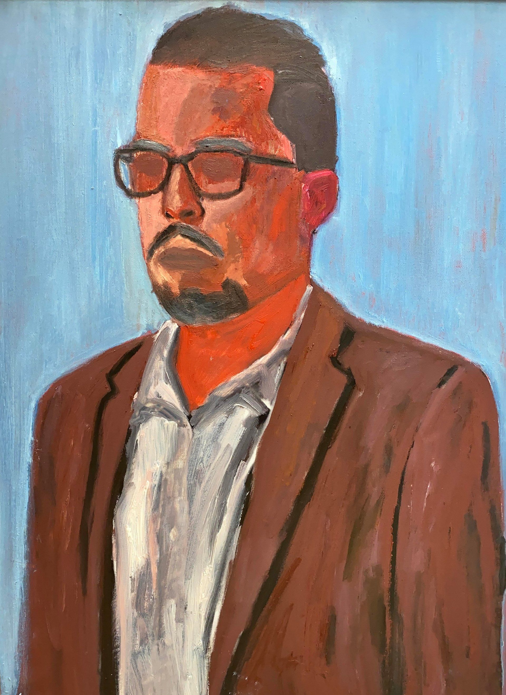Clinton Willis, The Artist In Reds And Mars Violet - My self-portrait is an oil painting influenced by the German expressionists of the early 20th century. Artists such as Max Beckmann, Ernst Kircher, and Emile Nolde have helped inspire me. My goal as an expressionist isn’t to capture realistic aspects surrounding the subject but rather the subjective emotions and responses that objects and events arouse within a person. I wanted my portrait to capture a stoic mood. As if an individual was looking at a statue rather than an oil painting of a man. When looking at the face, hardly any well-defined features stand out. When looking at the eyes in the portrait, they are deep and shaded in order to create an expressionless gaze.