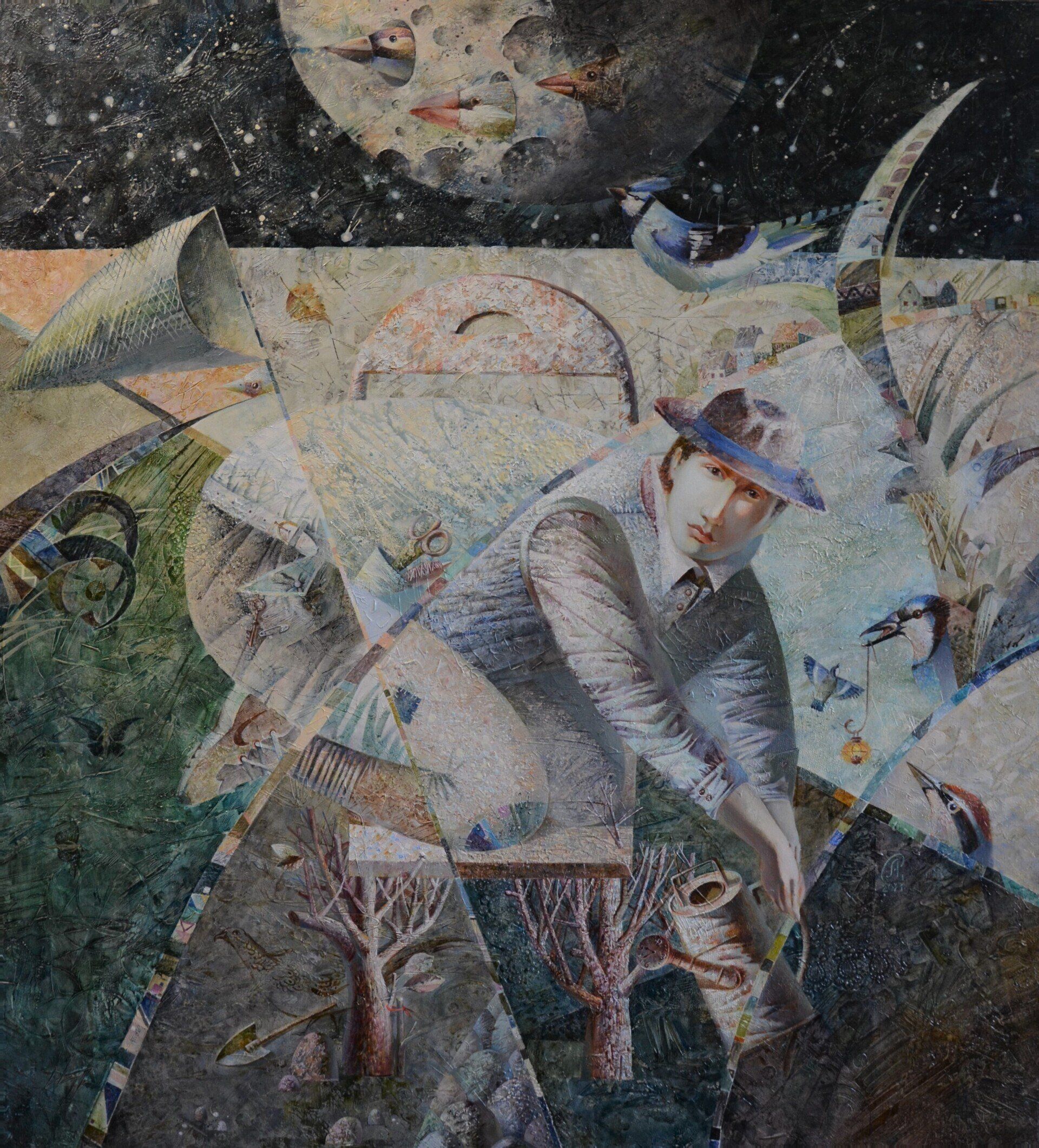 Alyona Sychyova, Star catcher - This is a metaphorical painting, where the hero is a symbol, and the charming details that create a “whole another world” complement and further reveal the idea of the painting. She creates a story within a story. The hero sits on a chair which legs are growing trees. What is this man doing? He’s watering them. After all, the higher the legs of the chair will grow, the higher the man will rise. The hero strives for his dreams, for the stars, the Star catcher.