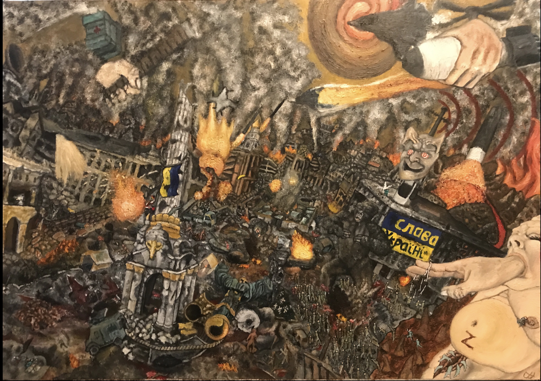 Ben Freeland, Kyiv, 2022 - I’m selecting this piece as I feel it is very relevant to the time we live in. It is A1 and painted in oils on a wooden board. The essence of the painting is that of the horror that’s occurring to our Ukrainian brothers and sisters, and how I chose to portray it in my own style as you can see. I’m equally as pleased with a number of my other paintings but this example, I feel, holds special importance as it’s the sort of imagery the world needs to see. Everything is symbolic, I hope it’s burned into your mind.