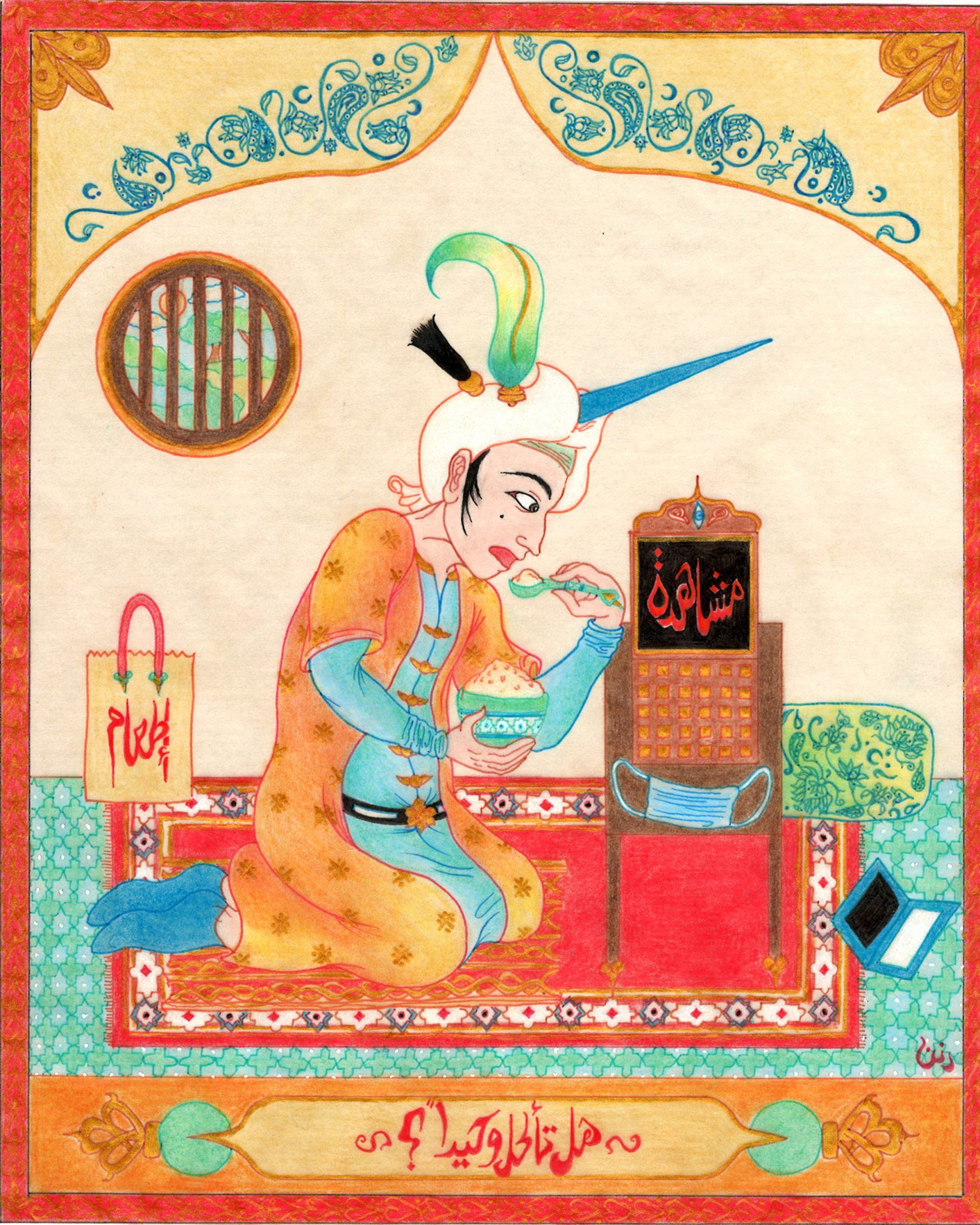 Dana Al Rashid, Do you Eat Alone? - A miniature representing the state of isolation that many of us have faced during the pandemic. A fun take on time travel, the medieval Islamic character watches a series on his magical device while eating a home-delivered meal, with his facemask laying about. The confined room becomes almost prison-like, isolating him from the lustrous green outdoors.