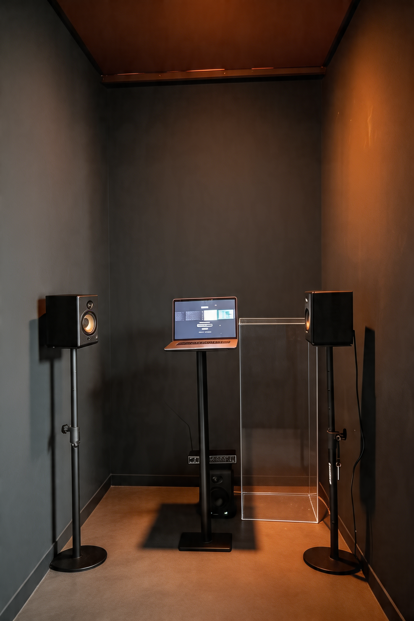 The moment you claim your code name, everything changes. The sound that has been surrounding you, a continuous, rotating sonic layer we call the manifesto loop, quietly pulls back. In its place, a unique sound composition emerges: a combination of textures drawn from a pre-built archive, assembled in real time, distributed across three speakers arranged in a triangle around your body. The sound is directed at your chest, your waist, your skin. You feel the Reveal.