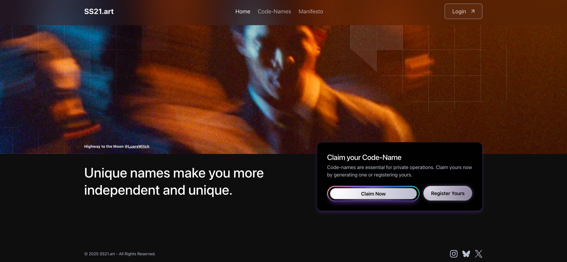 Then comes the choice. You can accept a code name generated randomly by the SS21.art platform by chance or you can compose your own, building a name that belongs to no database, no classification, no history. This is not a username. It is not a pseudonym for a social media account. It is a moment of decision about who you want to be, even